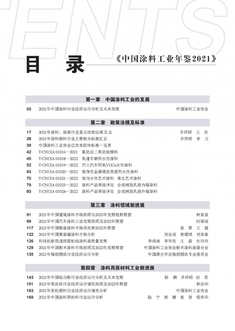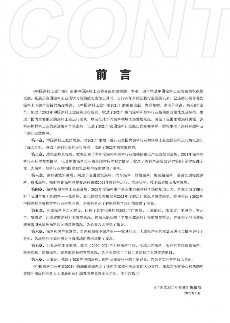 《中國(guó)涂料工業(yè)年鑒2021》共分7個(gè)章節(jié),總結(jié)了2021年中國(guó)涂料工業(yè)經(jīng)濟(jì)運(yùn)行現(xiàn)狀,收錄了2021年度與涂料和顏料行業(yè)相關(guān)的政策法規(guī)及標(biāo)準(zhǔn),闡述了我國(guó)涂料細(xì)分領(lǐng)域2021年度經(jīng)濟(jì)運(yùn)行、市場(chǎng)狀況、技術(shù)新進(jìn)展及未來(lái)發(fā)展,整理了國(guó)內(nèi)主要地區(qū)的涂料工業(yè)運(yùn)行及園區(qū)建設(shè)現(xiàn)狀,以及全球不同涂料領(lǐng)域市場(chǎng)發(fā)展?fàn)顩r,總結(jié)了我國(guó)主要涂料用原材料工業(yè)的新進(jìn)展和市場(chǎng)走勢(shì),記錄了2021年我國(guó)涂料行業(yè)經(jīng)歷的重要事件等。