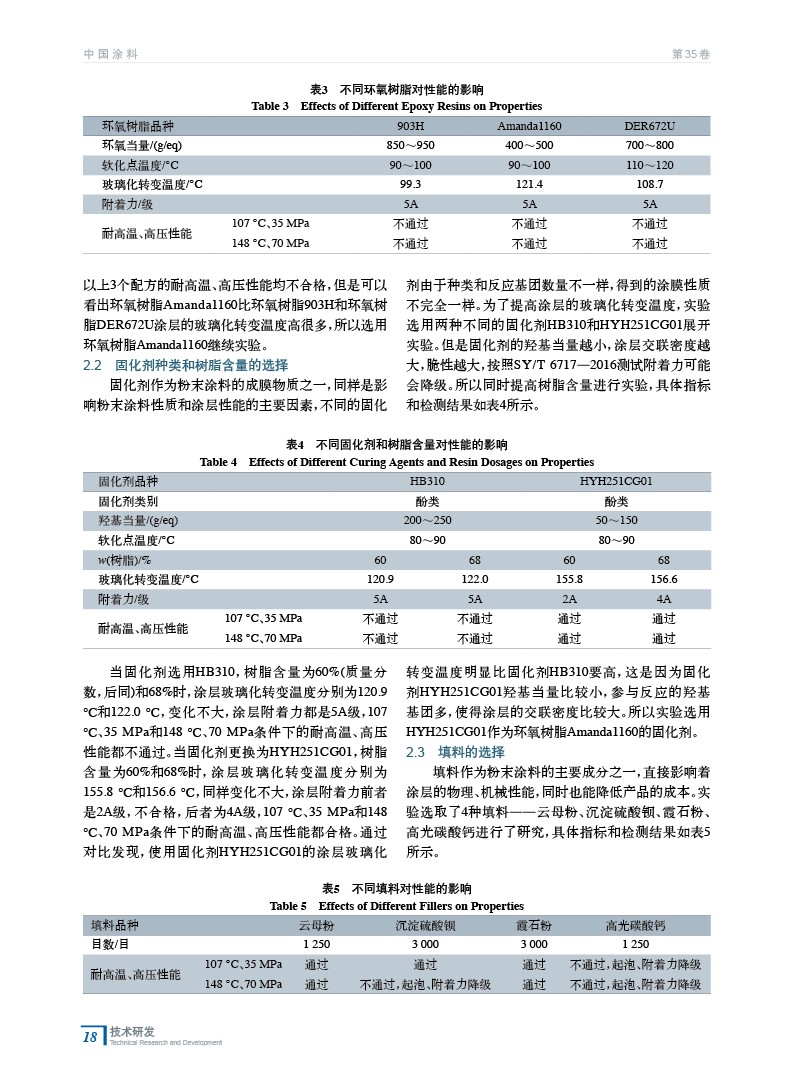 摘要:以SY/T 6717—2016《油管和套管內(nèi)涂層技術(shù)條件》為依據(jù),結(jié)合SY/T 0315—2013《鋼質(zhì)管道熔結(jié)環(huán)氧粉末外涂層技術(shù)規(guī)范》的相關(guān)檢測方法,通過探討環(huán)氧樹脂、固化劑、樹脂含量、填料和助劑等對涂膜性能的影響,從而研制出了耐高溫、高壓以及各項(xiàng)性能指標(biāo)均符合標(biāo)準(zhǔn)要求的粉末涂料。