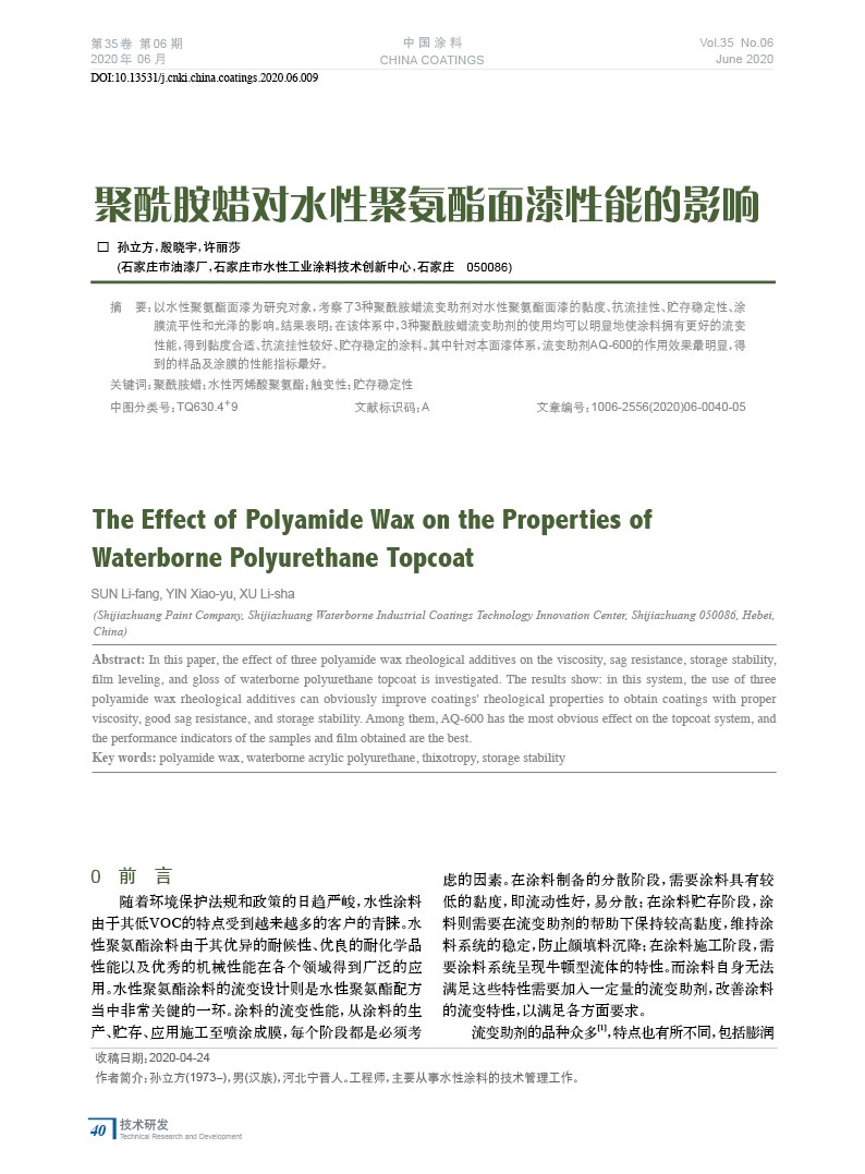 摘要:以水性聚氨酯面漆為研究對象,考察了3種聚酰胺蠟流變助劑對水性聚氨酯面漆性能的影響。結果表明:在該體系中,3種聚酰胺蠟流變助劑的使用均可以明顯地使涂料擁有更好的流變性能,得到黏度合適、抗流掛性較好、貯存穩定的涂料。其中針對本面漆體系,流變助劑AQ-600的作用效果最明顯,得到的樣品及涂膜的性能指標最好。