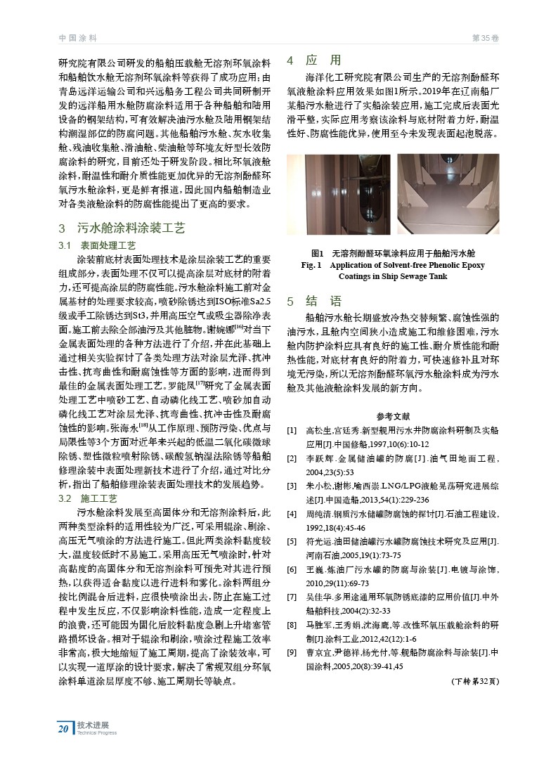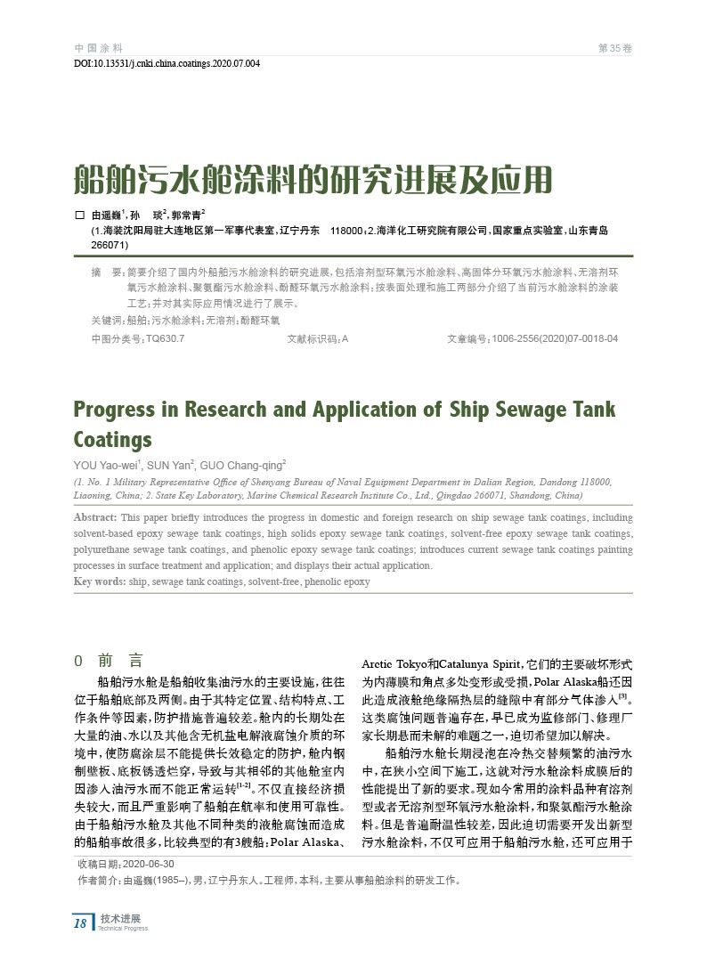 簡要介紹了國內外船舶污水艙涂料的研究進展,包括溶劑型環氧污水艙涂料、高固體分環氧污水艙涂料、無溶劑環氧污水艙涂料、聚氨酯污水艙涂料、酚醛環氧污水艙涂料;按表面處理和施工兩部分介紹了當前污水艙涂料的涂裝工藝;并對其實際應用情況進行了展示。