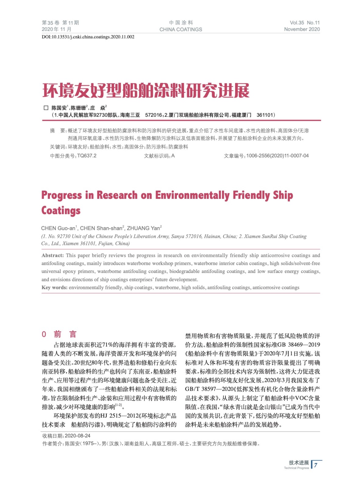 摘要:概述了環(huán)境友好型船舶防腐涂料和防污涂料的研究進展,重點介紹了水性車間底漆、水性內(nèi)艙涂料、高固體分/無溶劑通用環(huán)氧底漆、水性防污涂料、生物降解防污涂料以及低表面能涂料,并展望了船舶涂料企業(yè)的未來發(fā)展方向。