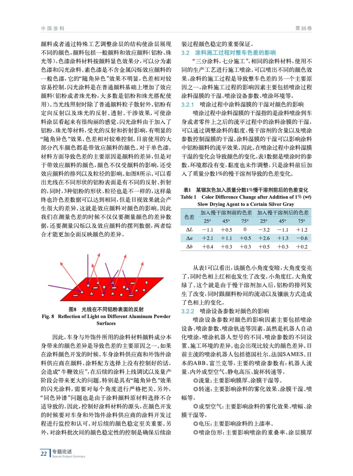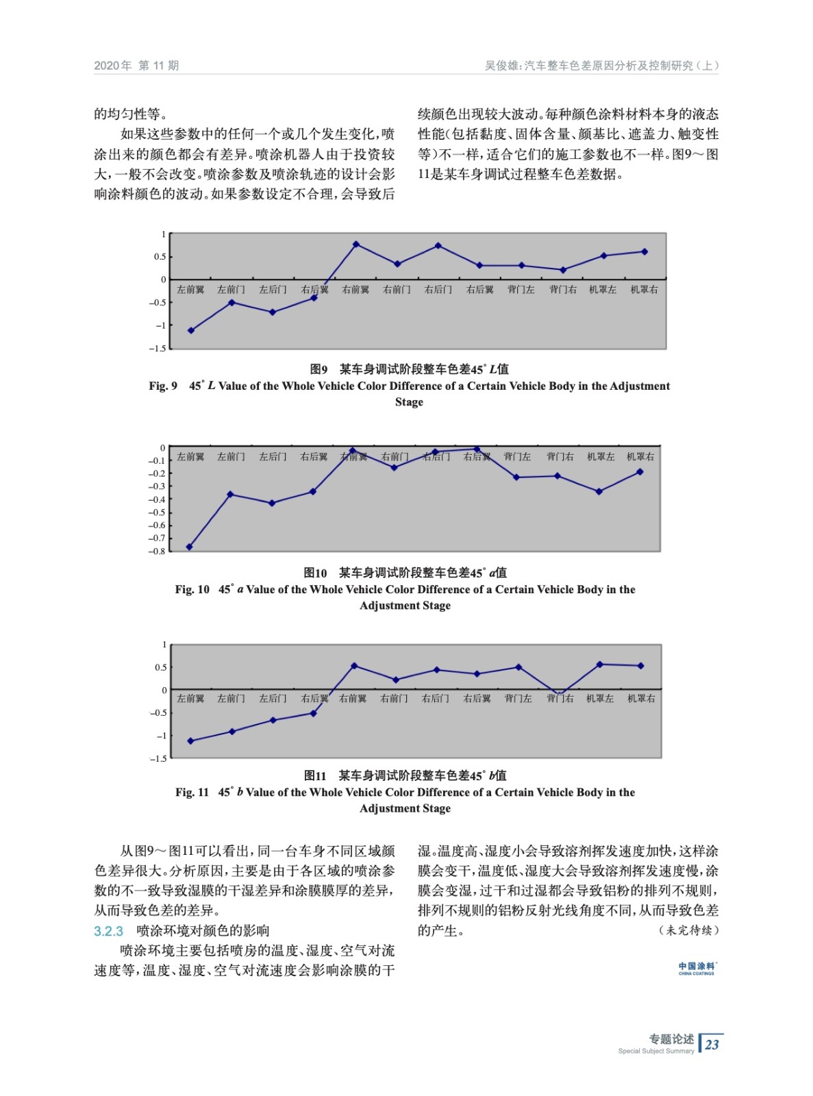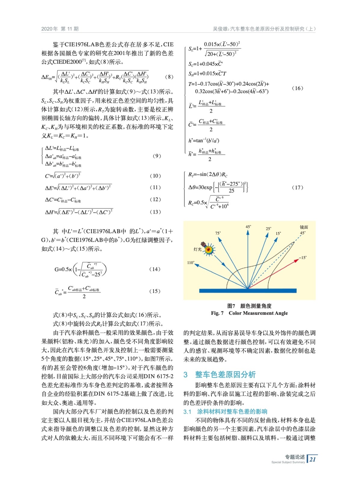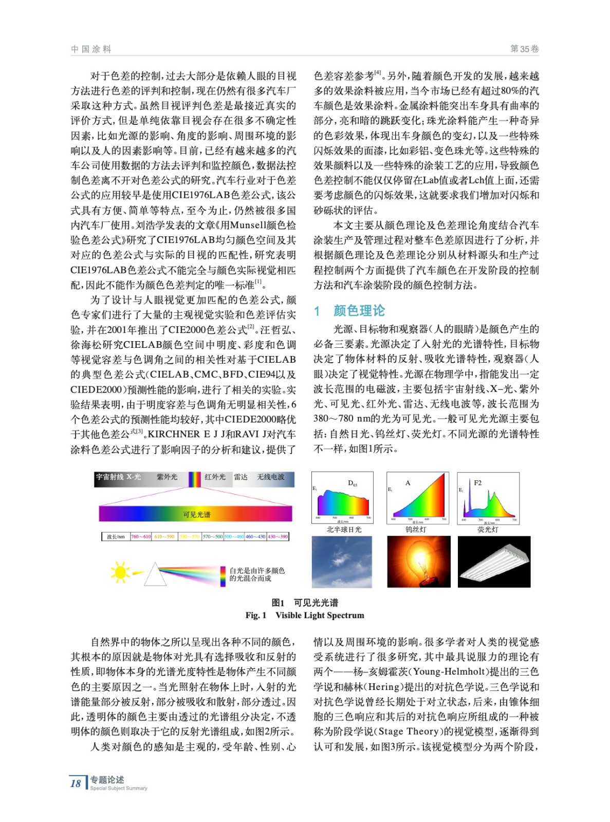 摘要:主要從光源的光譜特性、物體的反射及吸收光譜特性和人眼視覺的視覺理論介紹了顏色理論,從色差的目視評價和色差公式兩個方面介紹了色差理論。然后從涂料材料對整車色差的影響、涂料施工過程對色差的影響以及評價條件對色差的影響3個方面分析了整車色差產生的原因。最后結合顏色開發過程的施工性驗證和顏色的評價方法提出了汽車顏色的色差控制方法。