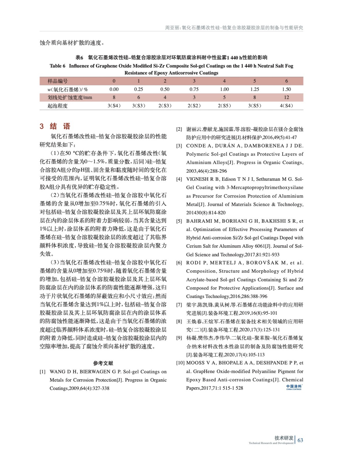 摘要:將氧化石墨烯引入硅–鋯復(fù)合溶膠,制備了氧化石墨烯改性硅–鋯復(fù)合溶膠凝膠涂層并研究了其性能。研究發(fā)現(xiàn):氧化石墨烯改性硅–鋯復(fù)合溶膠A組分具有優(yōu)異的貯存穩(wěn)定性;當(dāng)氧化石墨烯在硅–鋯復(fù)合溶膠中的質(zhì)量分?jǐn)?shù)從0增加至0.75%時(shí),氧化石墨烯對(duì)涂層體系的附著力影響較弱,并且提高了涂層體系的防腐蝕性能,當(dāng)其質(zhì)量分?jǐn)?shù)達(dá)到1%以上時(shí),隨著氧化石墨烯含量的增加,涂層體系的附著力和防腐蝕性能都逐漸降低。