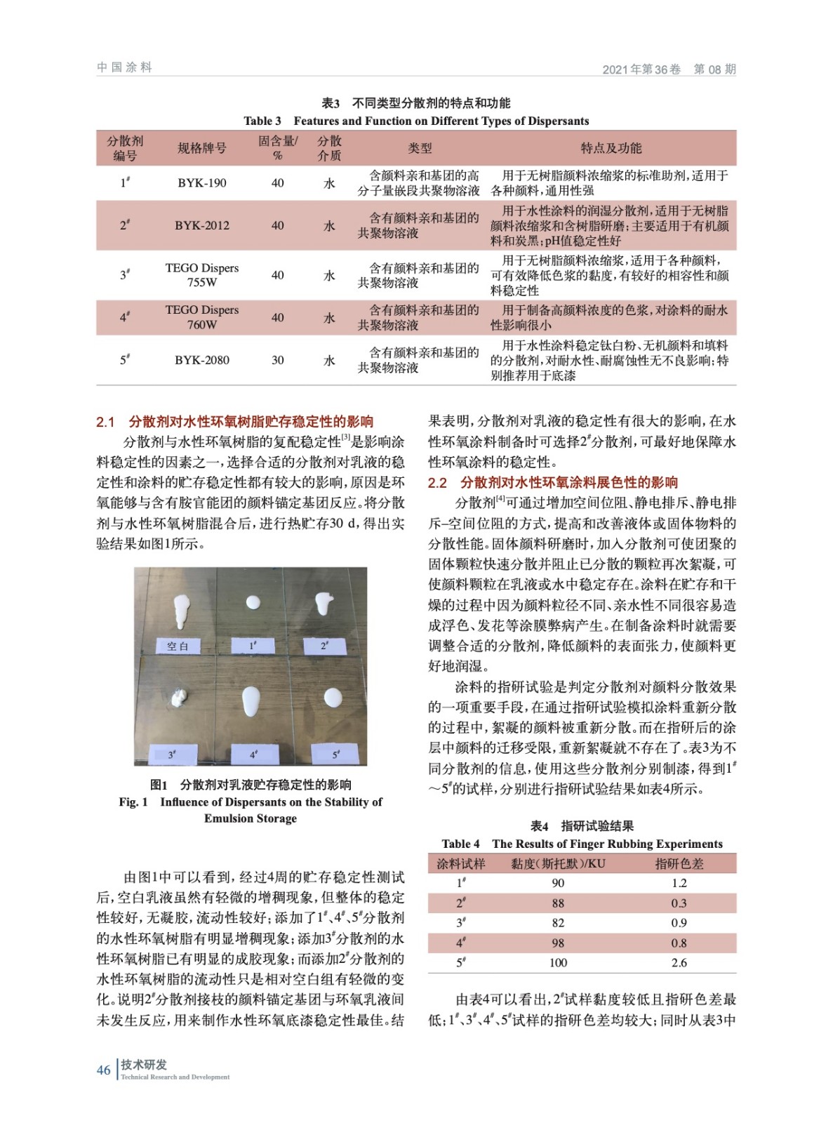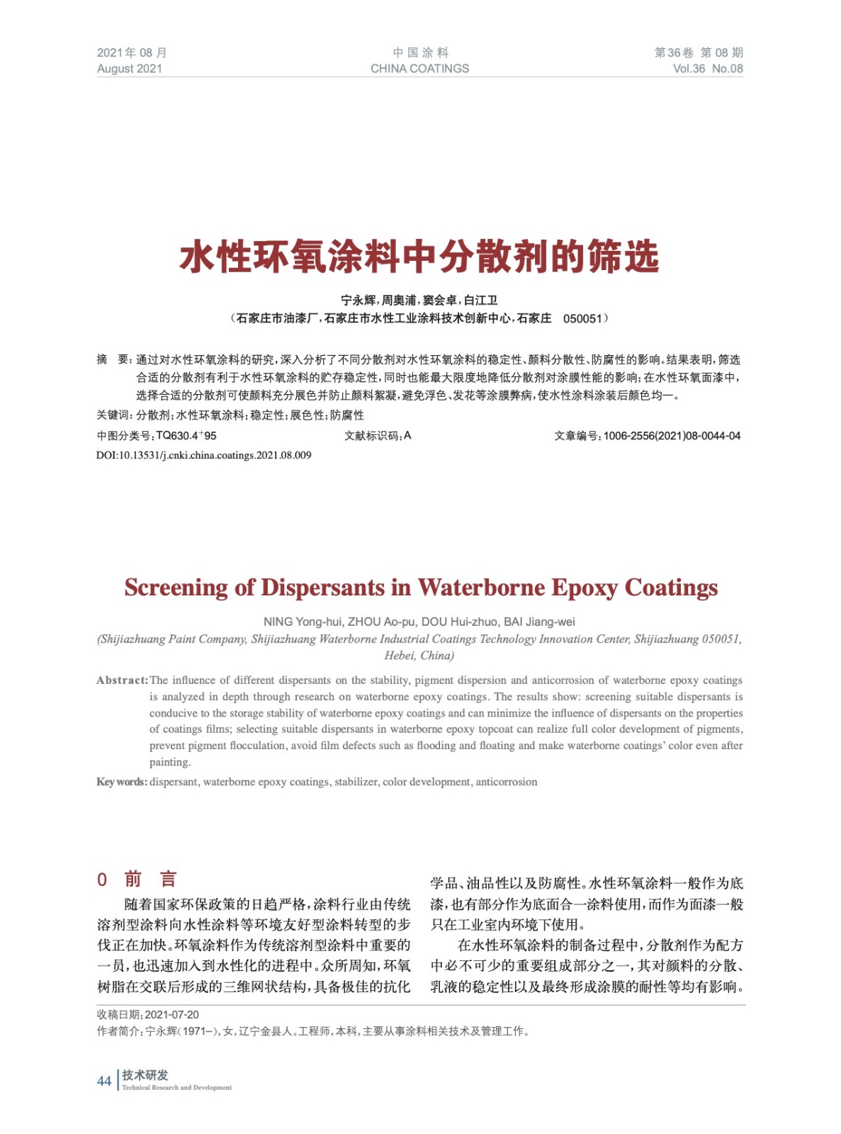 摘要:通過對水性環氧涂料的研究,深入分析了不同分散劑對水性環氧涂料的穩定性、顏料分散性、防腐性的影響。結果表明,篩選合適的分散劑有利于水性環氧涂料的貯存穩定性,同時也能最大限度地降低分散劑對涂膜性能的影響;在水性環氧面漆中,選擇合適的分散劑可使顏料充分展色并防止顏料絮凝,避免浮色、發花等涂膜弊病,使水性涂料涂裝后顏色均一。