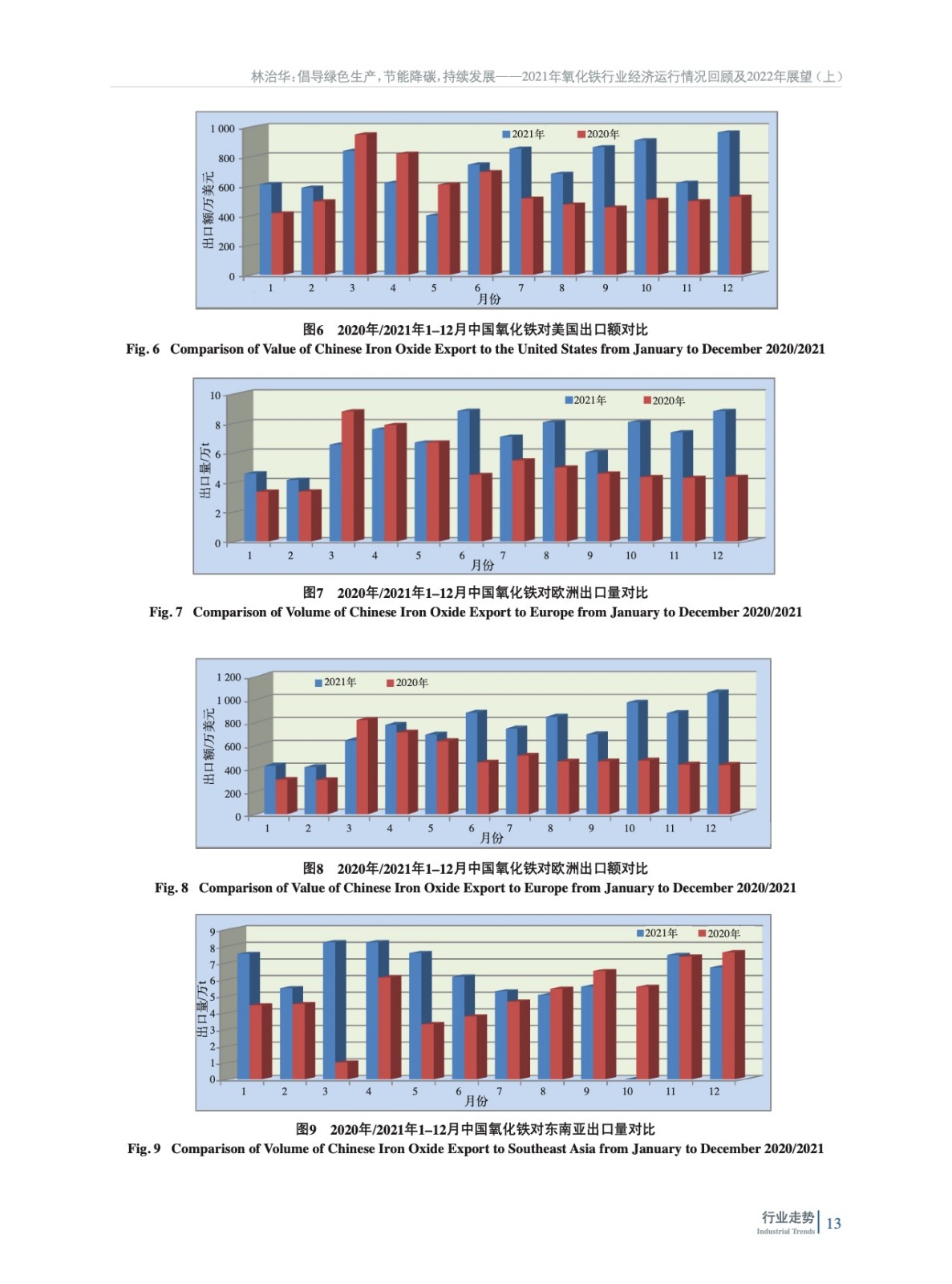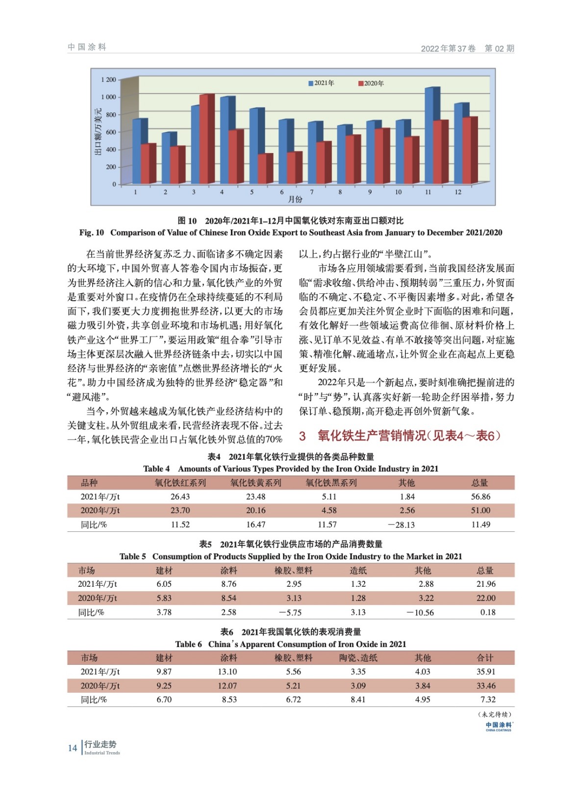摘要:綜述了2021年中國(guó)氧化鐵行業(yè)所處的經(jīng)濟(jì)環(huán)境,梳理了各項(xiàng)技術(shù)經(jīng)濟(jì)指標(biāo)完成情況、生產(chǎn)營(yíng)銷情況,并對(duì)行業(yè)進(jìn)出口數(shù)據(jù)進(jìn)行了分析,從能耗、標(biāo)準(zhǔn)等回顧了氧化鐵行業(yè)2021年發(fā)展?fàn)顩r,并展望了2022年發(fā)展方向,并指出了行業(yè)發(fā)展方向。