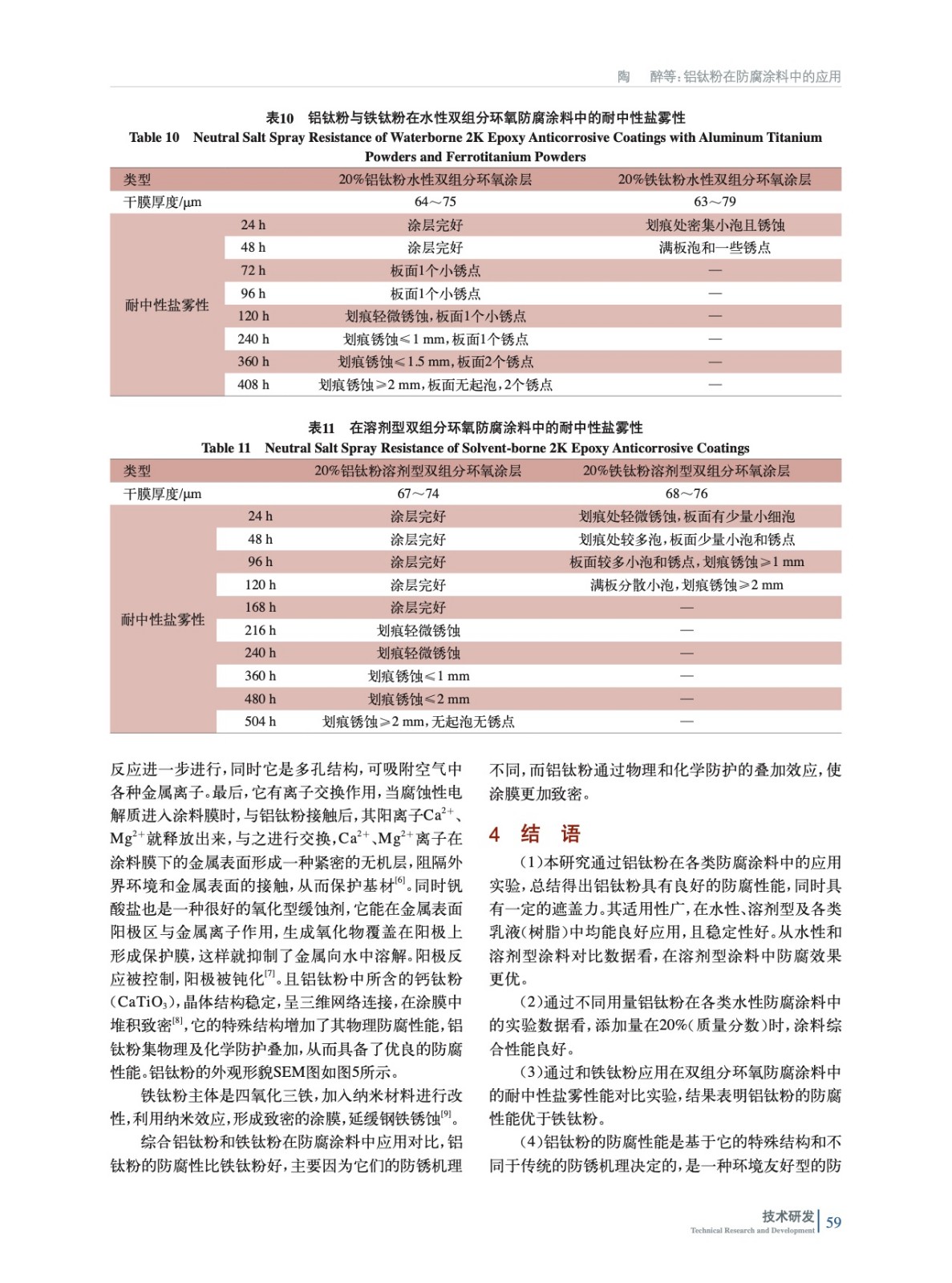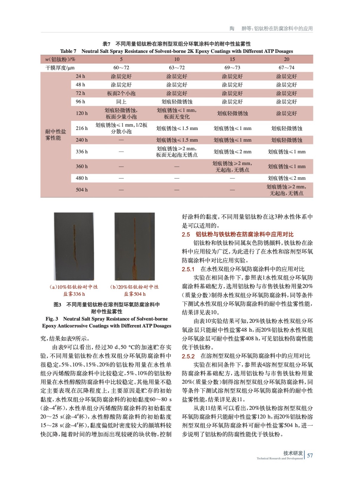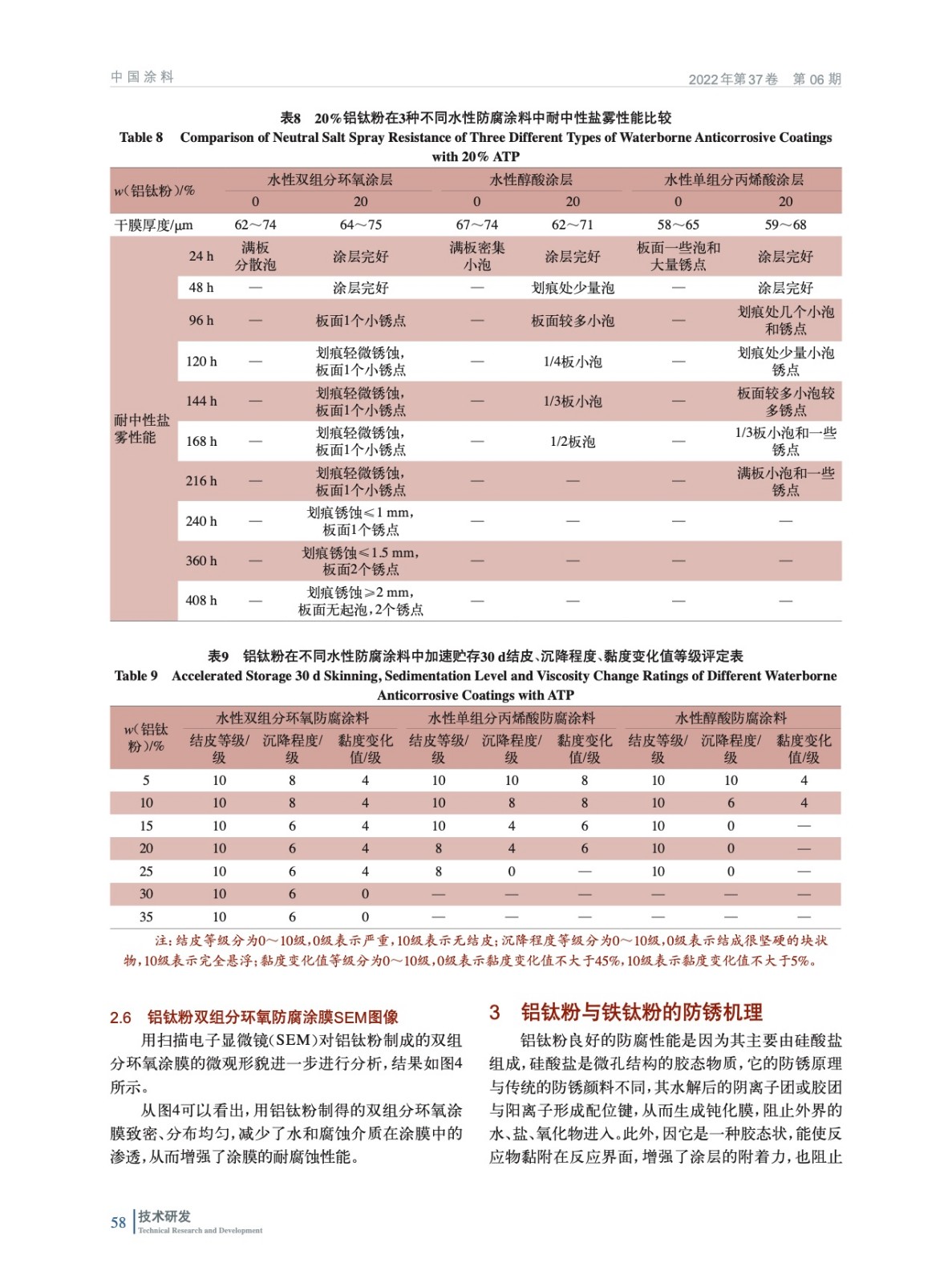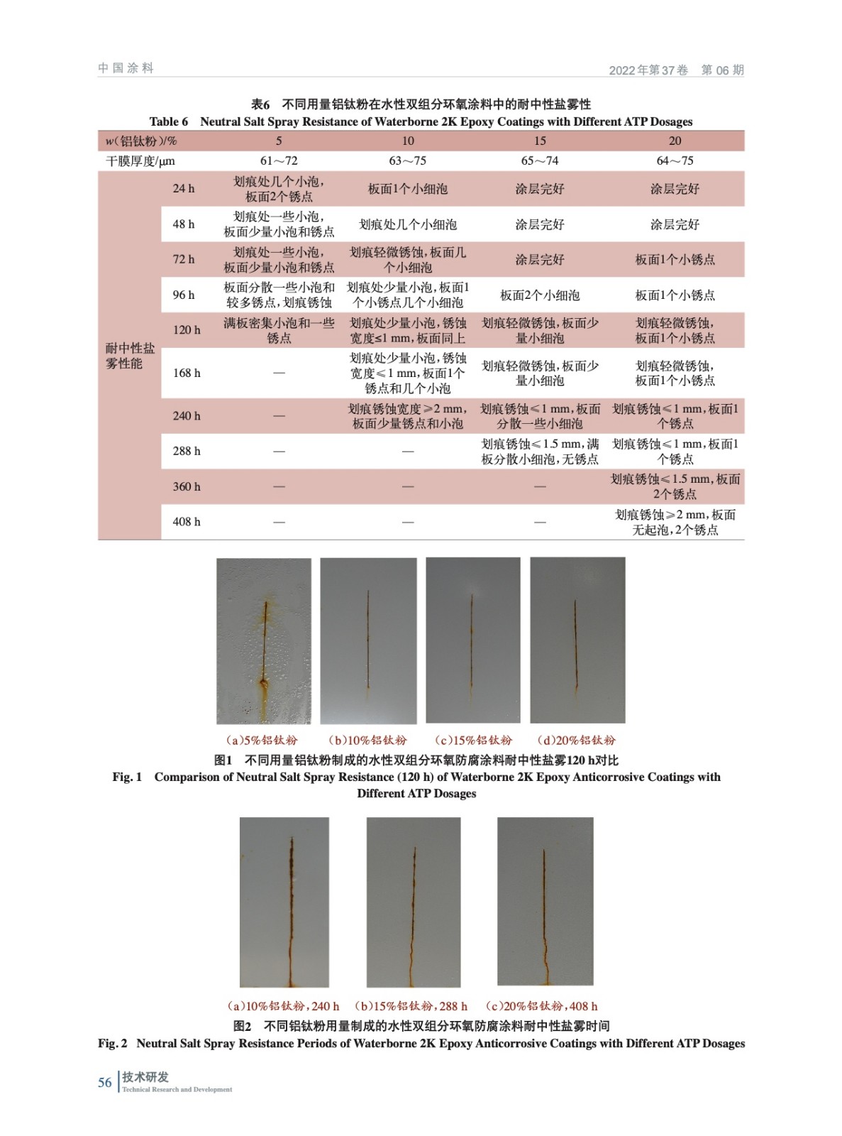 摘要:通過對鋁鈦粉在各類防腐涂料中的應(yīng)用實(shí)驗(yàn),結(jié)果表明鋁鈦粉具有良好的防腐性能,其用量在20%時,涂料綜合性能良好,水性雙組分環(huán)氧防腐涂料可耐中性鹽霧408 h,水性醇酸防腐涂料可耐中性鹽霧168 h,水性單組分丙烯酸防腐涂料中達(dá)216 h,溶劑型雙組分環(huán)氧防腐涂料中達(dá)500 h。且通過鋁鈦粉和鐵鈦粉的雙組分環(huán)氧防腐涂料耐中性鹽霧性能對比實(shí)驗(yàn),結(jié)果表明鋁鈦粉的防腐性更優(yōu)。