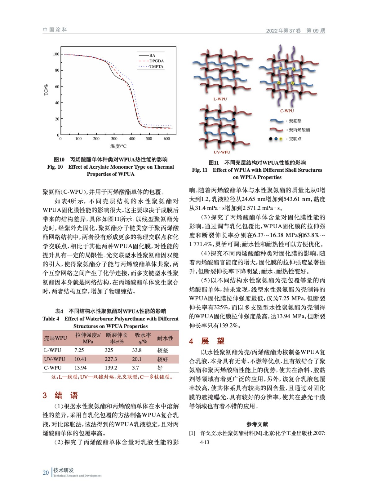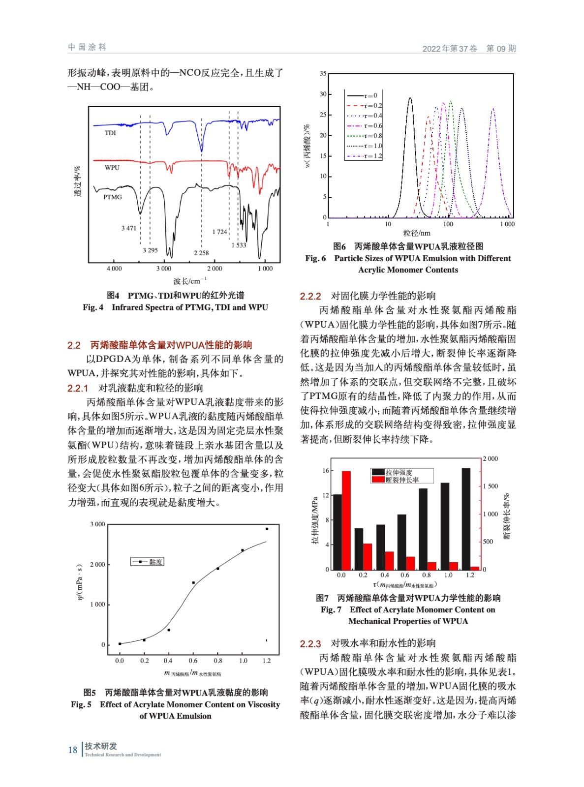 摘要:以聚四氫呋喃二醇、甲苯二異氰酸酯、2,2–雙(羥甲基)丙酸和1,4–丁二醇為主要原料,經(jīng)逐步聚合制得水性聚氨酯,并利用紅外光譜對(duì)其結(jié)構(gòu)進(jìn)行表征。以水性聚氨酯自乳化包覆丙烯酸酯單體,制備系列水性聚氨酯/丙烯酸酯核殼復(fù)合乳液(WPUA),并探究丙烯酸酯單體含量、種類及殼層水性聚氨酯結(jié)構(gòu)對(duì)復(fù)合乳液和固化膜性能的影響。