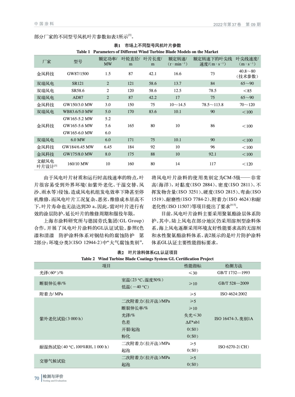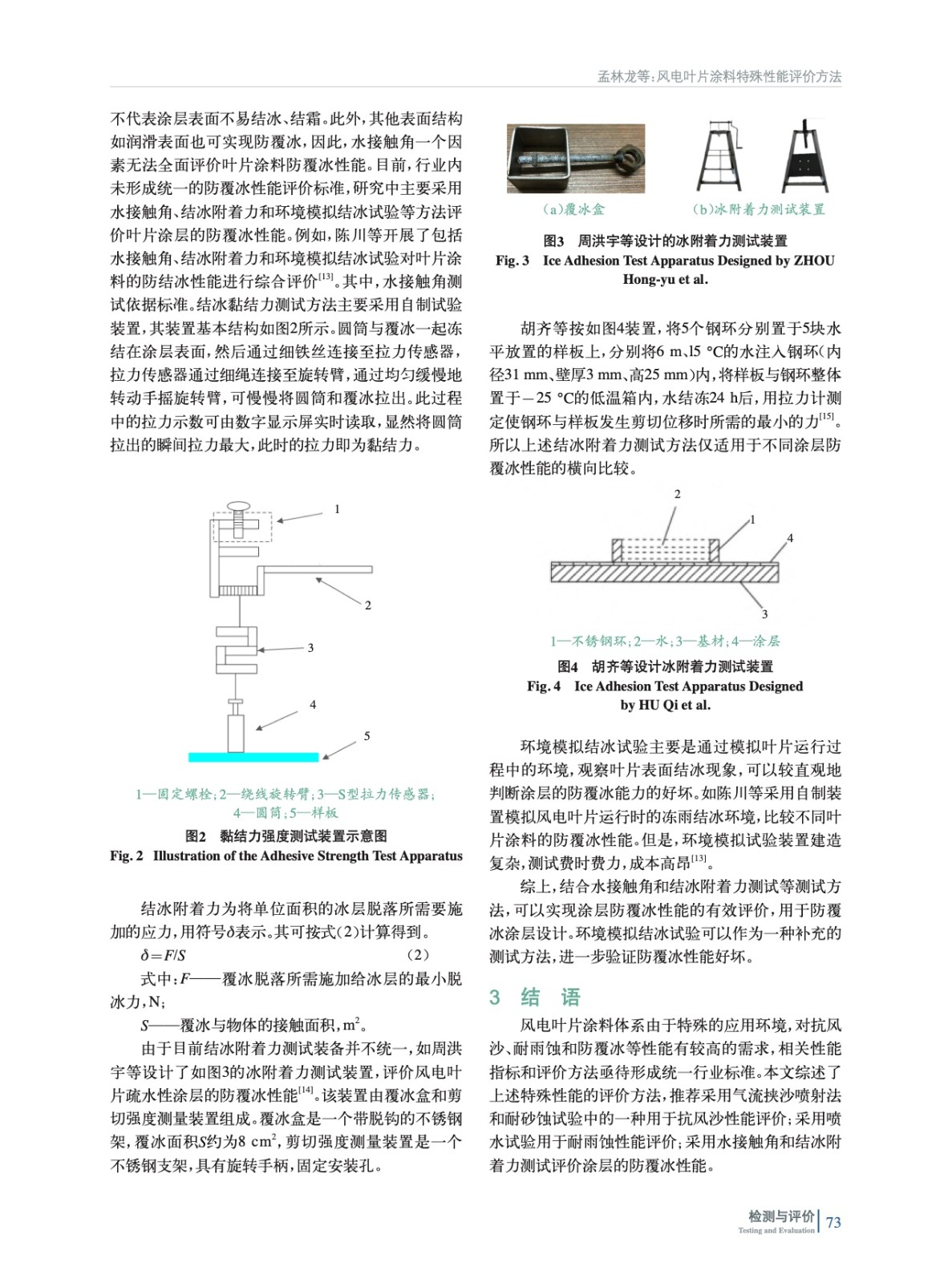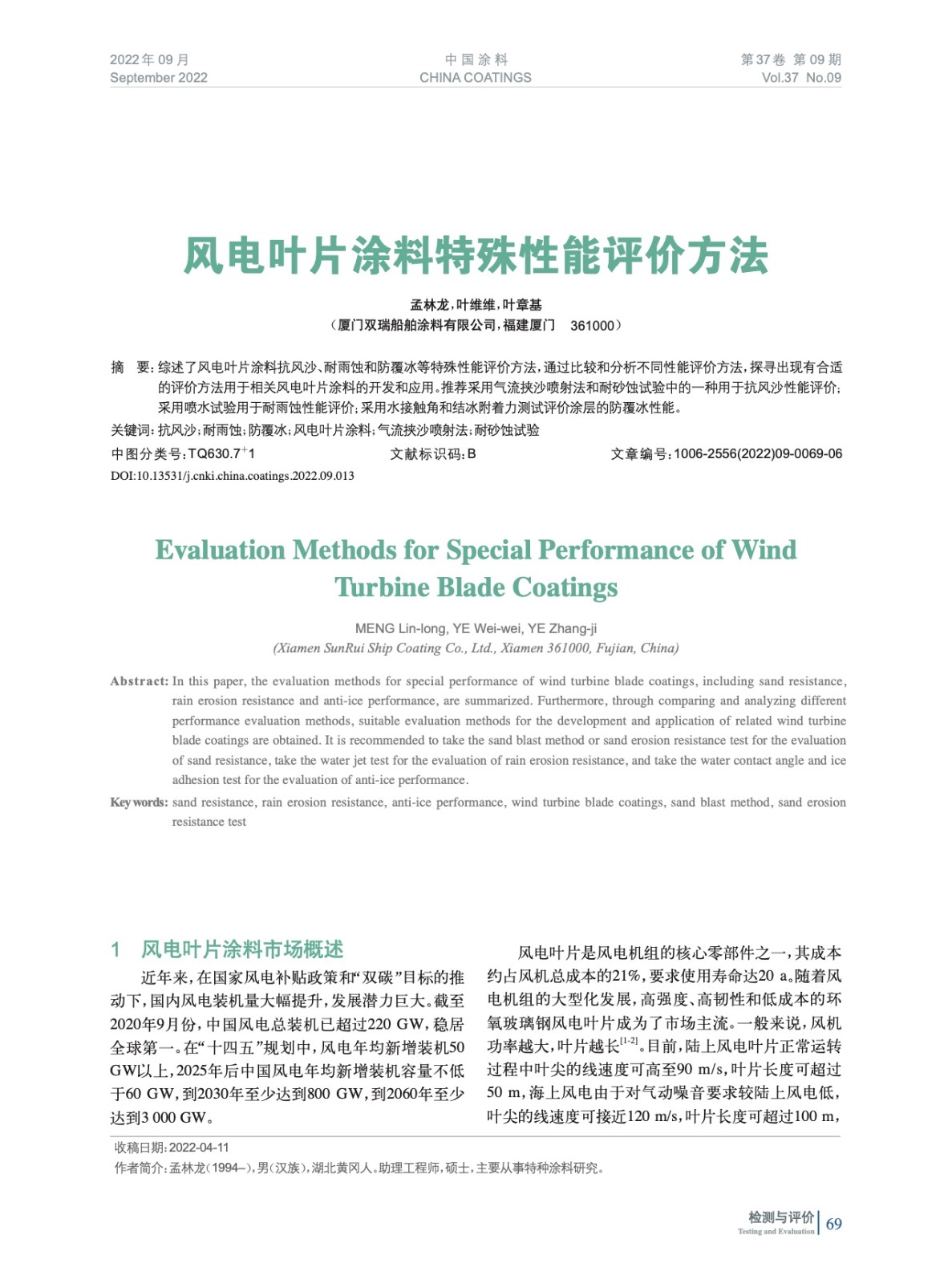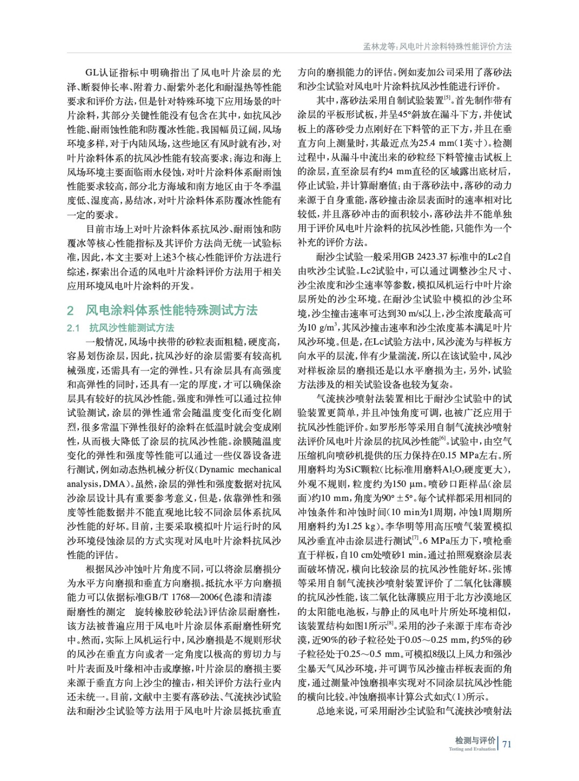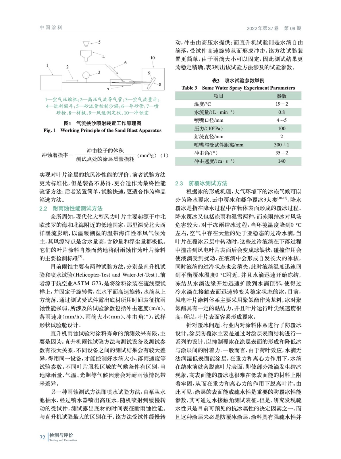 摘要:綜述了風電葉片涂料抗風沙、耐雨蝕和防覆冰等特殊性能評價方法,通過比較和分析不同性能評價方法,探尋出現(xiàn)有合適的評價方法用于相關風電葉片涂料的開發(fā)和應用。推薦采用氣流挾沙噴射法和耐砂蝕試驗中的一種用于抗風沙性能評價;采用噴水試驗用于耐雨蝕性能評價;采用水接觸角和結冰附著力測試評價涂層的防覆冰性能。