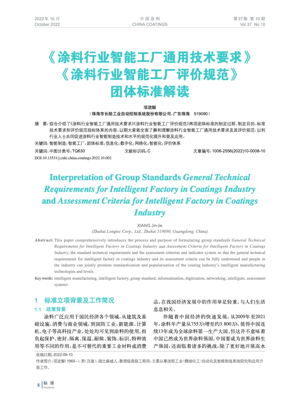 摘要:綜合介紹了《涂料行業(yè)智能工廠通用技術(shù)要求》《涂料行業(yè)智能工廠評價規(guī)范》兩項團(tuán)體標(biāo)準(zhǔn)的制定過程、制定目的、標(biāo)準(zhǔn)技術(shù)要求和評價規(guī)范指標(biāo)體系的內(nèi)容,以期大家能全面了解和理解涂料行業(yè)智能工廠通用技術(shù)要求及其評價規(guī)范,以利行業(yè)人士共同促進(jìn)涂料行業(yè)智能制造技術(shù)和水平的規(guī)范化提升和普及應(yīng)用。