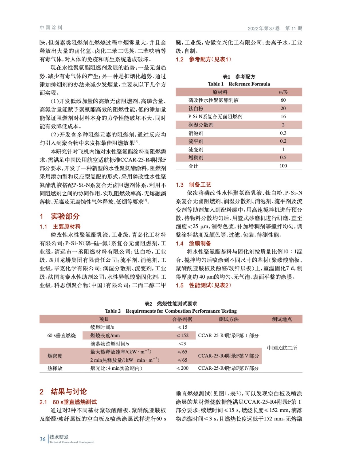 摘要:針對飛機內飾對水性聚氨酯涂層高阻燃要求,采用磷改性水性聚氨酯乳液搭配P-Si-N(磷–硅–氮)系復合無鹵阻燃劑體系開發了新型高阻燃水性聚氨酯涂層,涂覆在聚碳酸酯板、聚醚酰亞胺及酚醛/玻纖層板3種基材上,與空白板進行燃燒對比實驗,測試結果達到了《中國民用航空規章 第25部 運輸類飛機適航標準》[CCAR-25-R4]附錄F部分關于內飾阻燃的要求,涂層具有阻燃效率高、無熔融滴落物、無毒及無腐蝕性氣體釋放、低煙等特點,經驗證可完全應用在航空內飾上推廣使用。