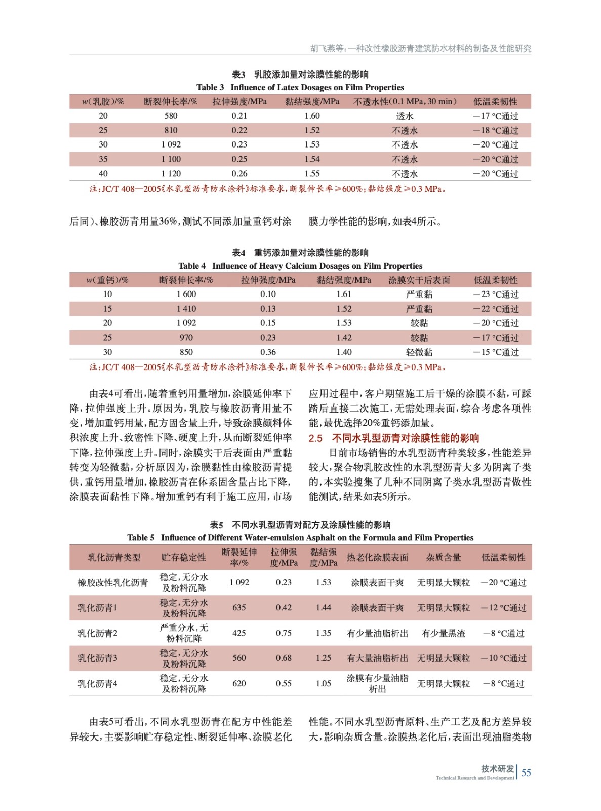 摘要:為了改善水乳型瀝青建筑防水涂料熱黏冷脆的缺點,自制了Tg為-21 ℃的高彈均相苯丙乳膠,探討了聚合物乳液、乳化瀝青的種類及添加量、重鈣的添加量對防水涂膜性能的影響。用掃描電鏡對防水涂層的微觀結構進行了分析,用差熱分析儀DSC、高低溫恒溫恒濕箱、萬能材料試驗機、電動不透水儀等對防水涂層的玻璃化溫度、低溫柔韌性、耐熱度、機械性能、防滲透性能等進行測試。結果表明,當添加自制苯丙乳膠30%(質量分數,后同)、橡膠乳化瀝青36%、重鈣20%時,制備的液體防水涂料涂膜斷裂伸長率為1 092%,低溫柔韌性通過-20 ℃,120 ℃無流淌、滑動。