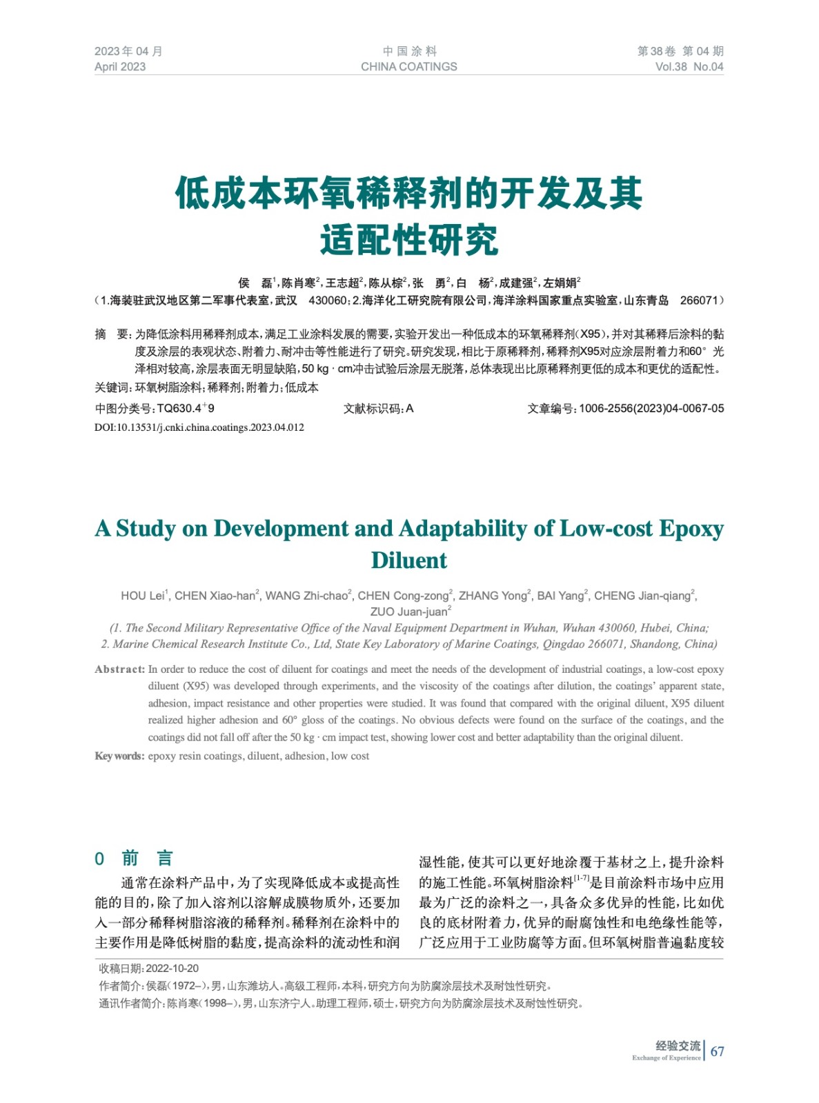 發表于2023-07-23 23:04:30| 次閱讀| 來源中國涂料| 作者侯 磊,陳肖寒,王志超,陳從棕,張 勇,白 楊,成建強,左娟娟