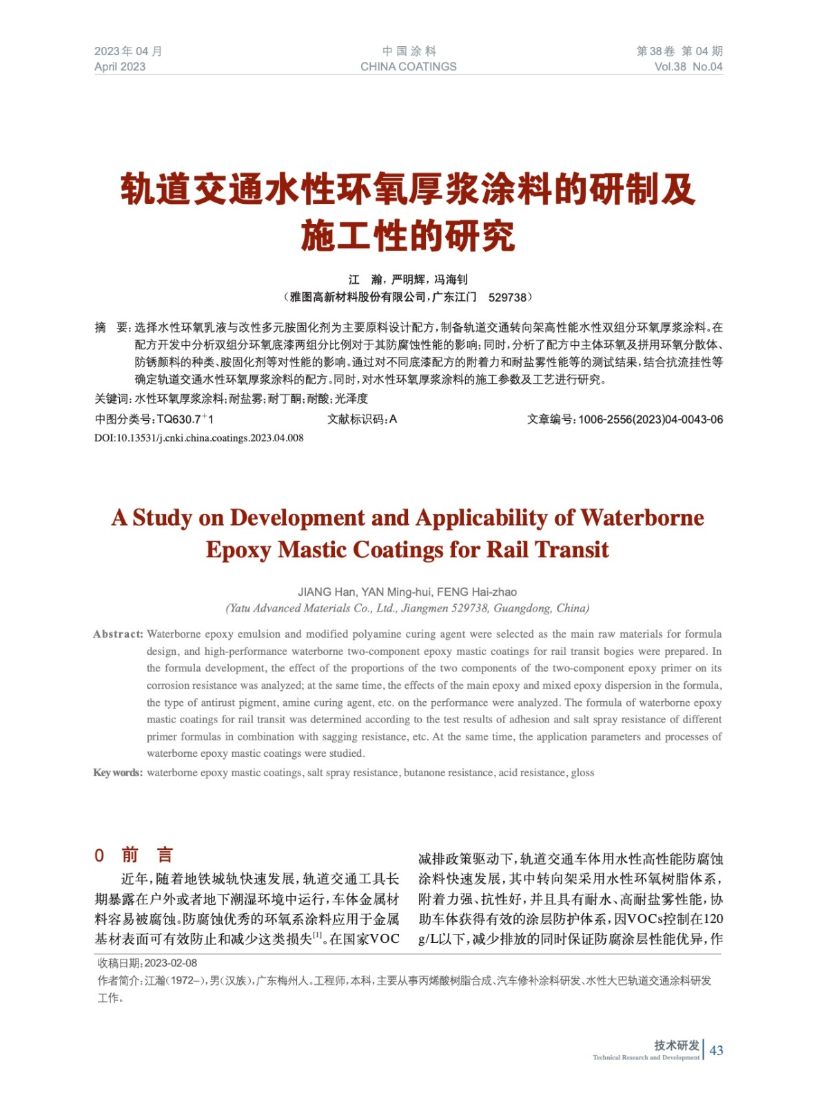 軌道交通水性環氧厚漿涂料的研制及施工性的研究