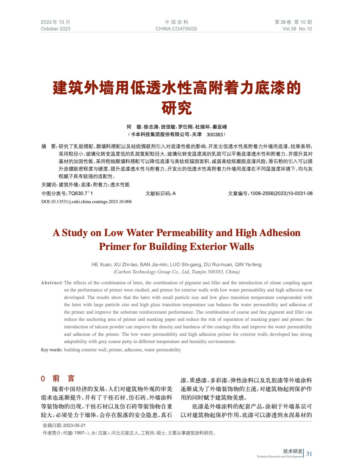摘要:研究了乳膠搭配、顏填料搭配以及硅烷偶聯劑引入對底漆性能的影響,開發出低透水性高附著力外墻用底漆。結果表明:采用粒徑小、玻璃化轉變溫度低的乳膠復配粒徑大、玻璃化轉變溫度高的乳膠可以平衡底漆透水性和附著力,并提升其對基材的加固性能。采用粗細顏填料搭配可以降低底漆與美紋紙錨固面積,減弱美紋紙撕脫底漆風險;滑石粉的引入可以提升涂膜致密程度與硬度,提升底漆透水性與附著力。開發出的低透水性高附著力外墻用底漆在不同溫濕度環境下,均與灰粗膩子具有較強的適配性。