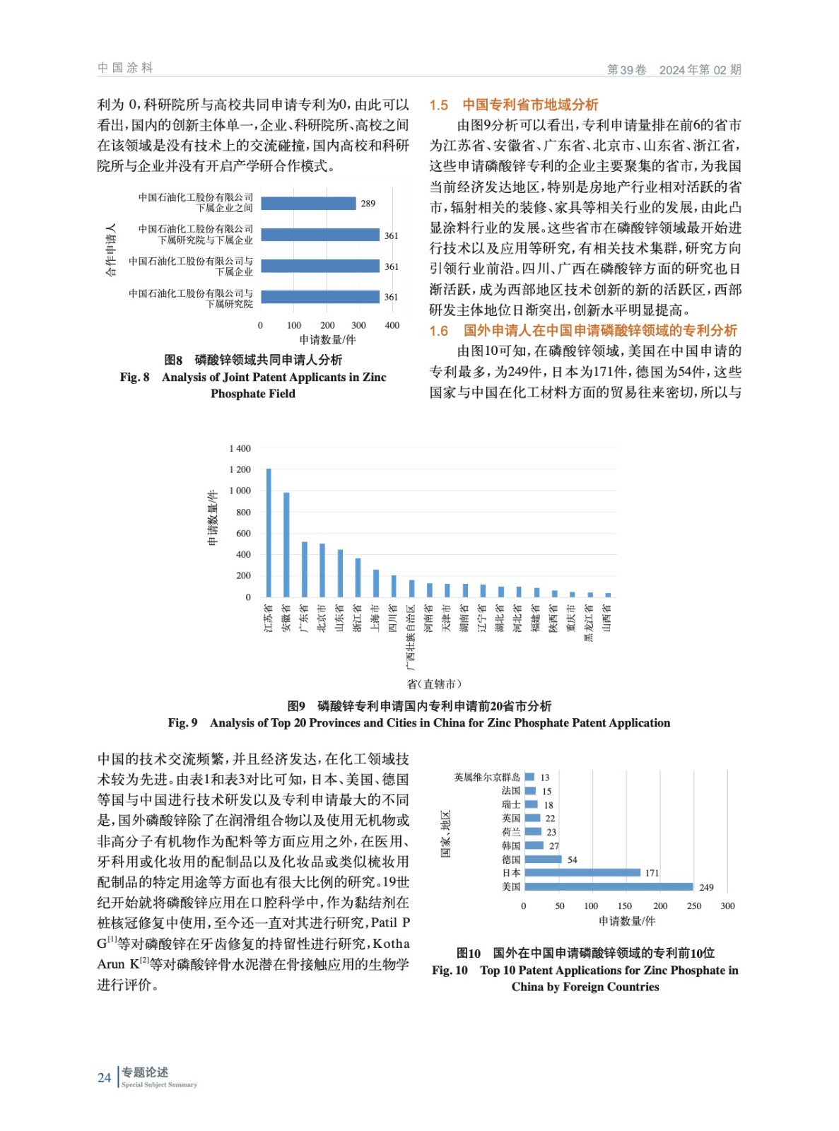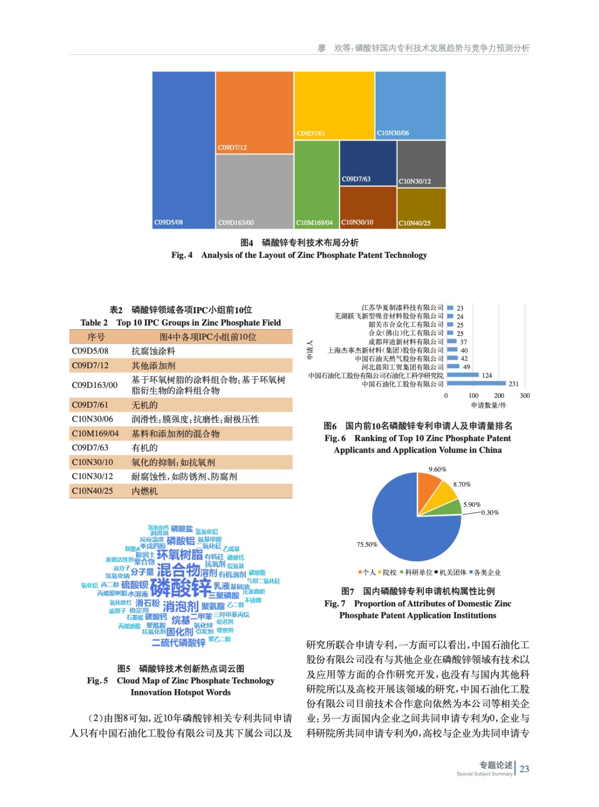 摘要:通過研究我國磷酸鋅申請專利保護的情況,對其自主創新和專利應用的特點進行了全面分析。分析表明,2011–2018年我國磷酸鋅專利申請量上升,2019–2022年開始下降,專利申請類型以發明專利為主,專利保護以磷酸鋅在涂料中的應用(其中主要是抗腐蝕涂料)為主。同時通過對磷酸鋅專利技術發展趨勢與競爭力預測的分析,以及對開發高端磷酸鋅產品的方式和現有專利的運營方式提出了建議。