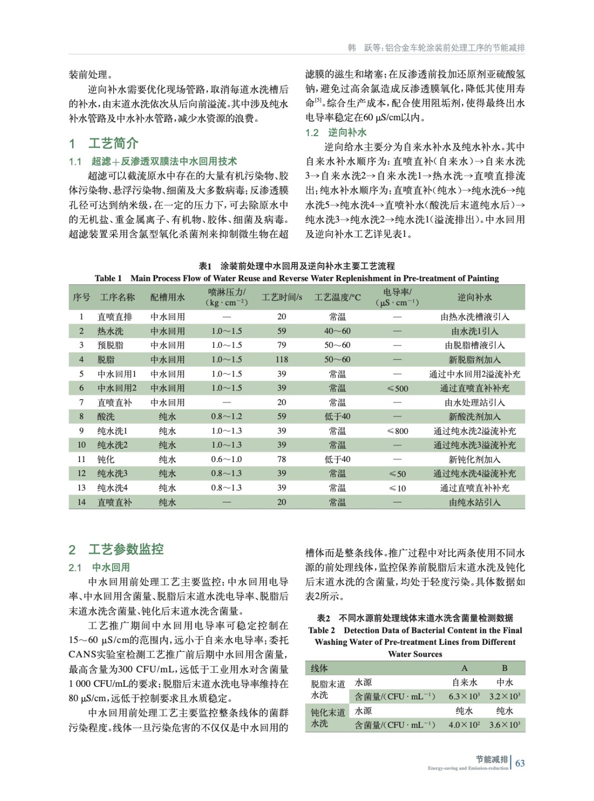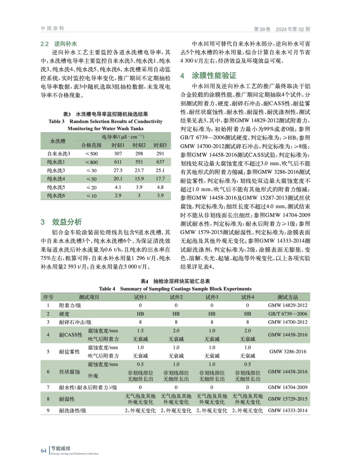 摘要:為提高水資源利用效率,達到節能降耗的目的,對鋁合金車輪前處理進行中水回用及逆向補水可行性研究。優化補水管路,嚴格監控水洗槽電導率及末道水洗菌群污染程度;對鋁合金車輪涂膜性能(附著力、硬度、耐碎石沖擊、耐CASS試驗、耐鹽霧性、耐絲狀腐蝕性、耐水性、耐濕性及耐洗滌劑)進行測試。結果標明:涂裝前處理中水回用及逆向補水工藝穩定,水洗槽電導率及末道水洗含菌量均滿足前處理工藝指標要求,涂膜性能合格。