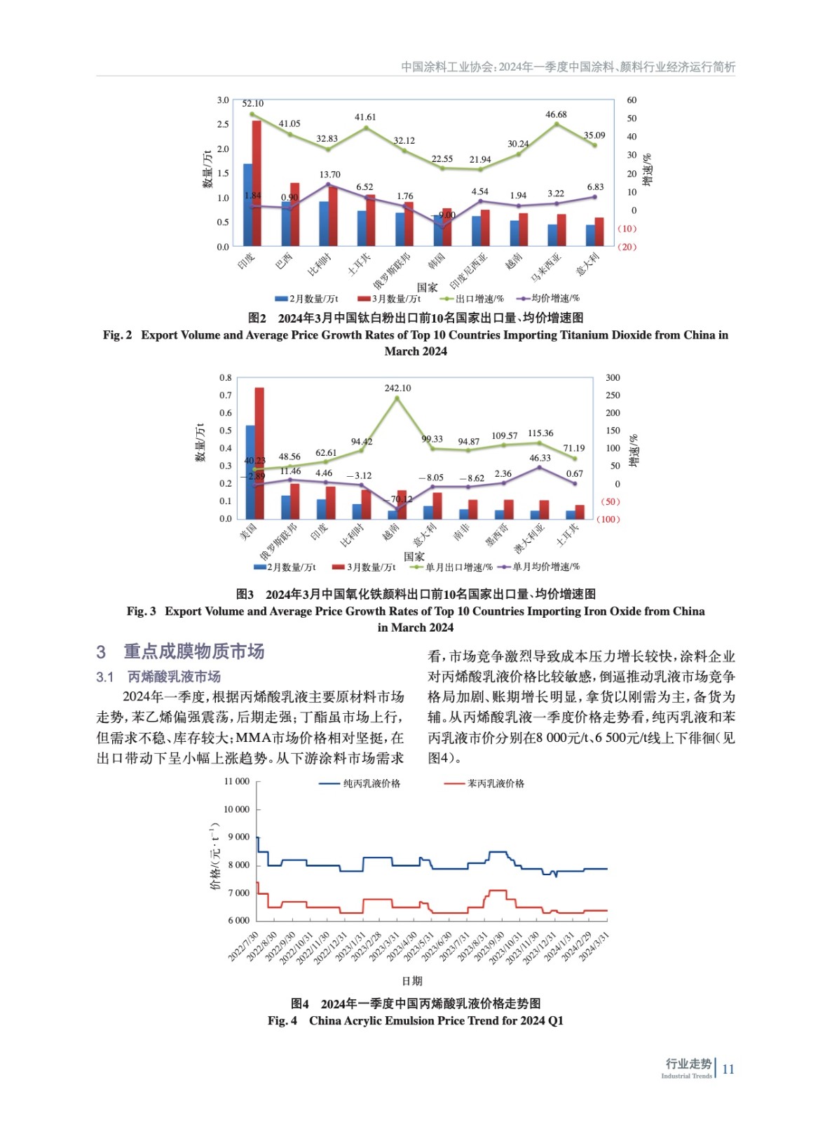 摘要:簡(jiǎn)析了2024年第一季度我國涂料行業(yè)生產(chǎn)、經(jīng)營和涂料、無機(jī)顏料行業(yè)進(jìn)出口簡(jiǎn)況,并對(duì)丙烯酸乳液、環(huán)氧樹脂等重點(diǎn)成膜物質(zhì)市場(chǎng)進(jìn)行了綜述和預(yù)測(cè)。對(duì)2024年一季度涂料行業(yè)雙指數(shù)進(jìn)行了分析,并對(duì)二季度市場(chǎng)進(jìn)行了預(yù)測(cè)。