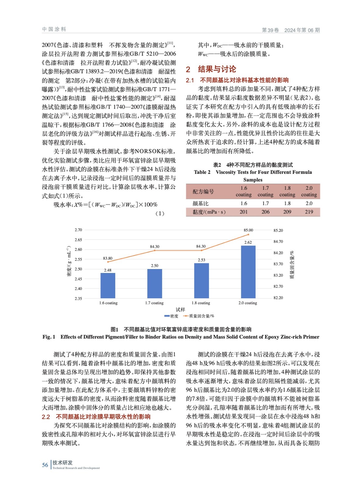 摘要:在80%鋅含量環氧涂料中,以長石粉作為另一種輔助顏填料,通過改變總顏填料與基料的比例(即顏基比),制備了臨界狀態附近4種不同顏基比(1.6、1.7、1.8以及2.0)的涂料樣品,并探究了顏基比對涂膜形成結構以及涂膜防腐蝕性能的影響。測試結果顯示,隨著顏基比的增加,4種測試涂層的吸水率增大,96 h泡水測試后,顏基比為2.0的涂層吸水率約為1.6顏基比涂層的7.8倍;電化學測試Bode圖中低頻阻抗模量(Z0.01 Hz)減小,1.6顏基比涂層的阻抗值約為2.0顏基比涂層阻抗值的10倍,意味著涂層的阻隔性能減弱;連續冷凝、耐鹽霧以及耐濕熱防腐測試后涂膜的附著力均有所降低,表明了涂膜的防腐性能降低。盡管顏基比越高涂料的價格降低,但從環氧富鋅底漆應具備良好的防銹性能再追求性價比的角度考慮,顏基比建議不高于2.0,以確保防腐測試后涂層仍具有優異的附著力(不低于5 MPa)。