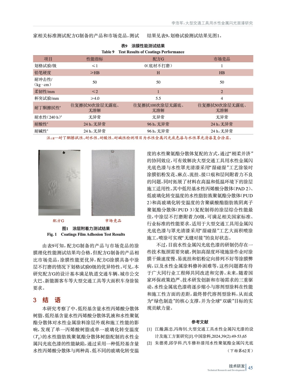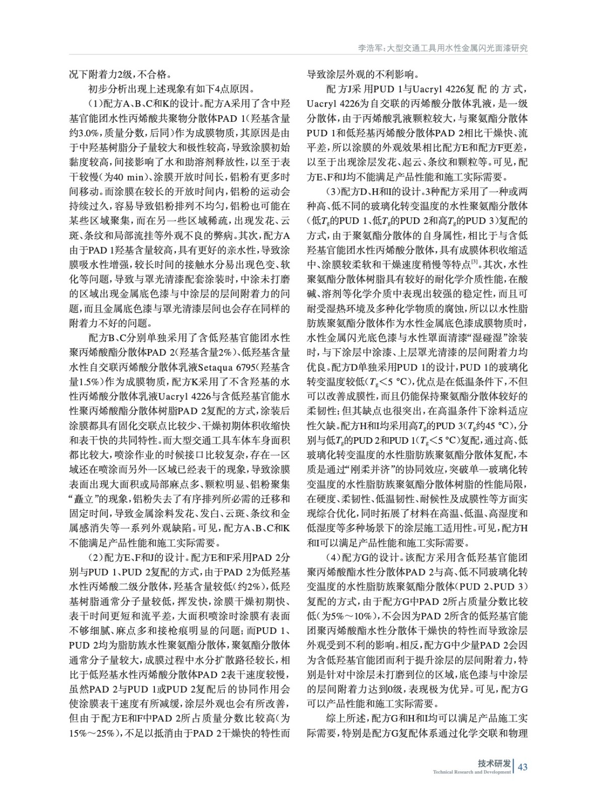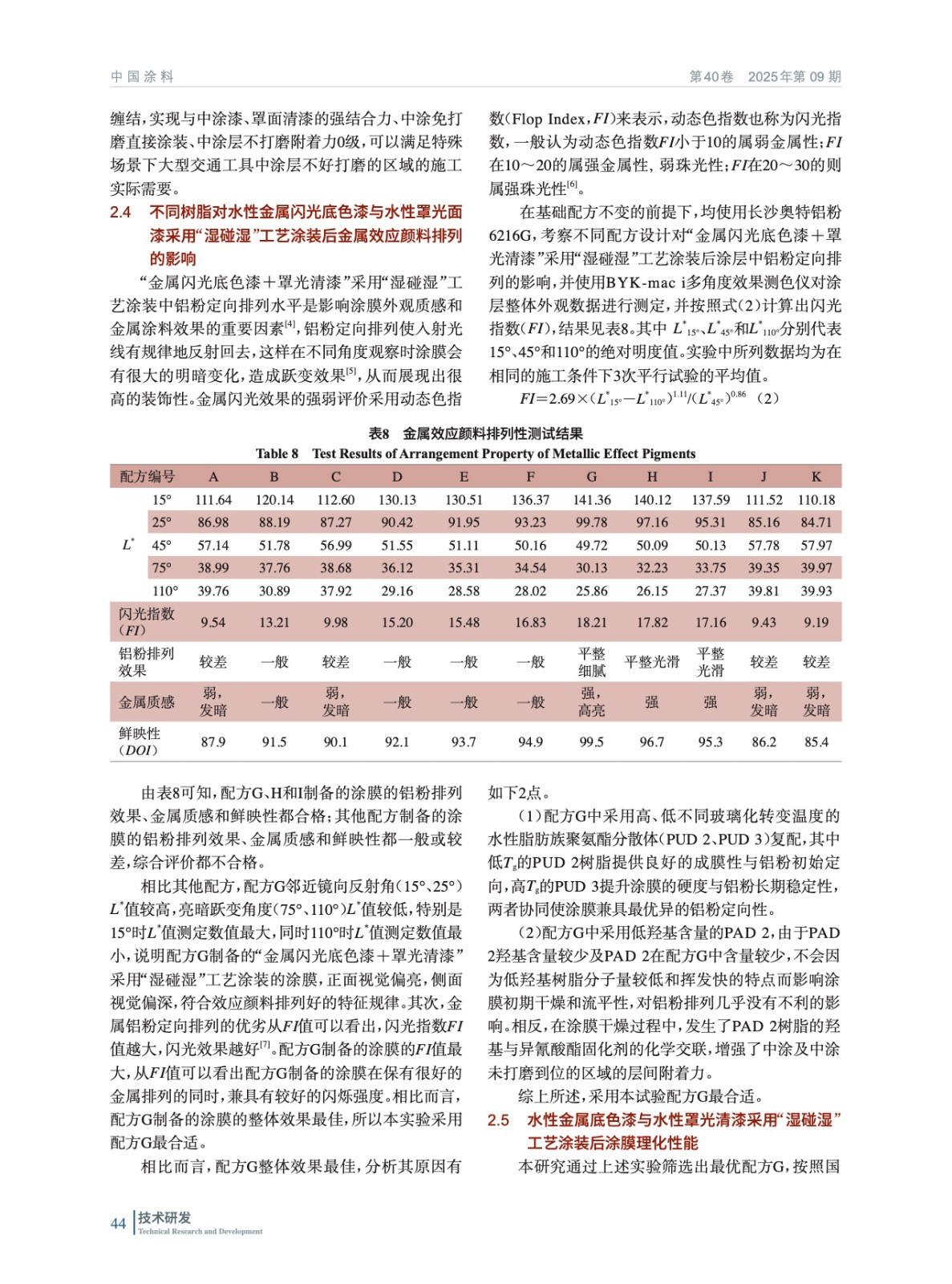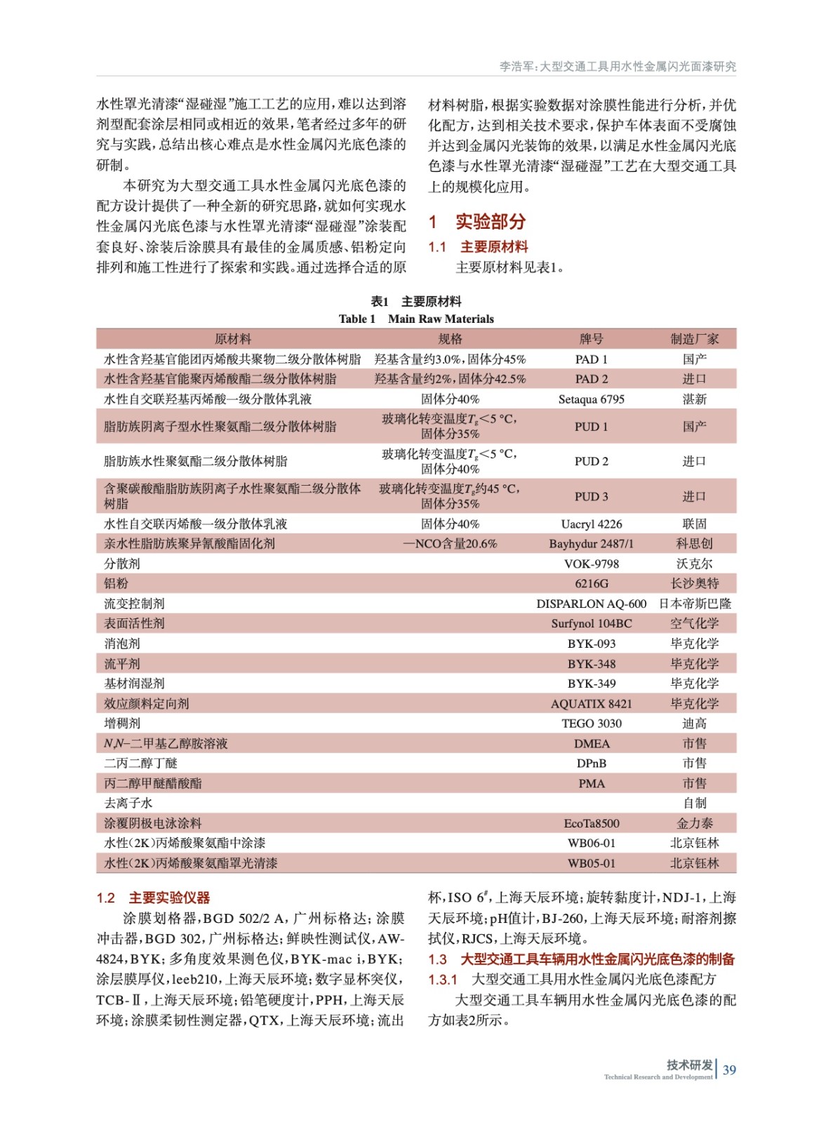 摘要:主要通過研究中、低羥基含量水性丙烯酸分散體樹脂、水性丙烯酸分散體乳液和高、低不同的玻璃化轉變溫度的水性聚氨酯分散體等水性樹脂對水性金屬閃光底色漆觸變指數、抗流掛性的影響,以及對水性金屬閃光底色漆與水性罩光面漆采用“濕碰濕”工藝時干燥性及涂裝后金屬效應顏料排列外觀效果的影響,采用遞進式研究方法,制備了一種新型水性金屬閃光底色漆。該“濕碰濕”配套水性罩光清漆,整體配套面漆效果已通過GB/T 13492—2025《汽車用涂料》標準中核心項目驗證。