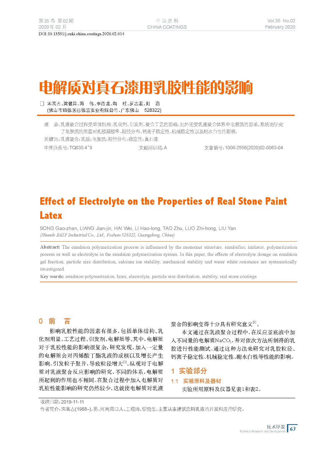 乳液聚合過程受單體結構、乳化劑、引發劑、聚合工藝的影響,此外還受乳液聚合體系中電解質的影響。系統地研究了電解質的用量對乳膠凝膠率、粒徑分布、鈣離子穩定性、機械穩定性以及耐水白性的影響。