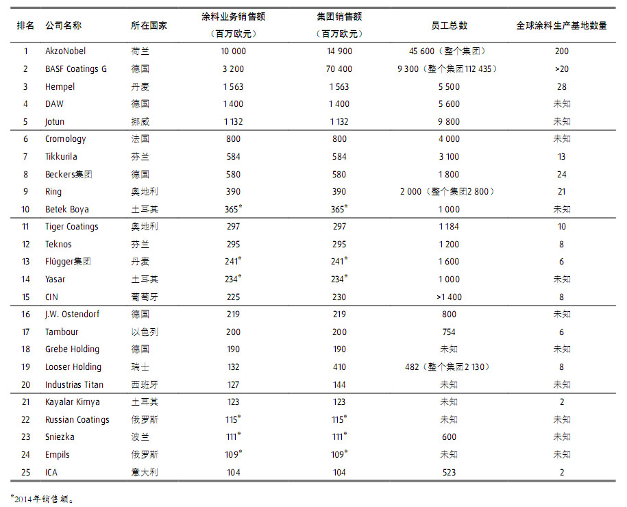 歐洲涂料企業前25名排行榜
