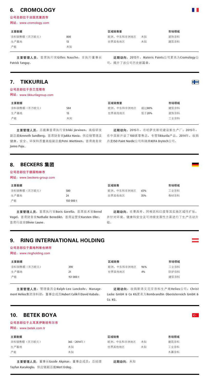 摘要:本雜志根據各公司的收益情況,對總部設在歐洲大陸的歐洲涂料行業前25名進行了排行。