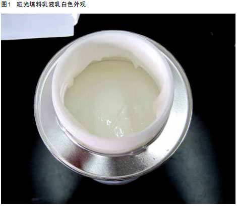 這種消光填料的物理性質(zhì)見(jiàn)表1。 100%固體分的輻射固化基料不含溶劑,不含單體(活性稀釋劑),25°C時(shí),黏度約為3 500 mPa·s,并呈現(xiàn)牛頓型特性。盡管外觀是乳白色的(圖1),但是在完全固化后則是透明的。