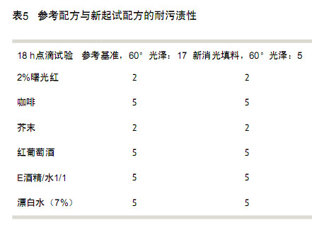 因此,對(duì)于參照配方和新起試配方的所有涂料,對(duì)其耐性進(jìn)行18 h的點(diǎn)滴試驗(yàn)。將每一種涂料以25 μm的濕膜厚度涂覆到白色Leneta紙上,并且使用兩個(gè)80 W Hg 燈,以10 m/min速度進(jìn)行固化。如表5中所示,這兩種涂料的耐性相同,但是,含消光填料的涂料無(wú)光澤,而參照涂料的光澤要高出3倍以上。