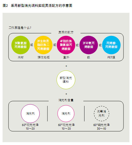 為滿足涂料配方設(shè)計(jì)者更靈活,更自由地設(shè)計(jì)配方,最大限度降低庫(kù)存和運(yùn)輸成本,設(shè)計(jì)了一種新型消光填料,可以作為摻混料廣泛用于多種涂料體系(見(jiàn)圖 2):在紫外線的全波段范圍內(nèi)或在發(fā)光二極管和電子束輻射下固化的涂料及傳統(tǒng) UV。
