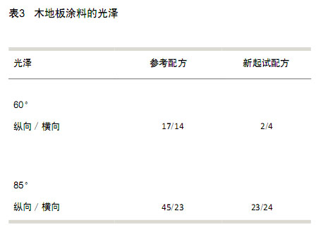 然后,分別將標(biāo)準(zhǔn)配方和新涂料配方按濕膜厚度25 μm涂覆到事前刷涂3道芳香族聚氨脂丙烯酸酯樹(shù)脂進(jìn)行封閉處理的木板上。使用兩個(gè)80W Hg燈,以10 m/min 速度進(jìn)行紫外光固化。沿著長(zhǎng)度方向和橫向,對(duì)每一塊木板的光澤進(jìn)行測(cè)量,結(jié)果如表3所示。