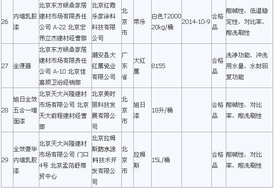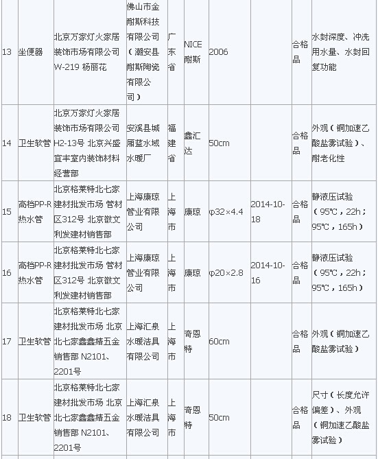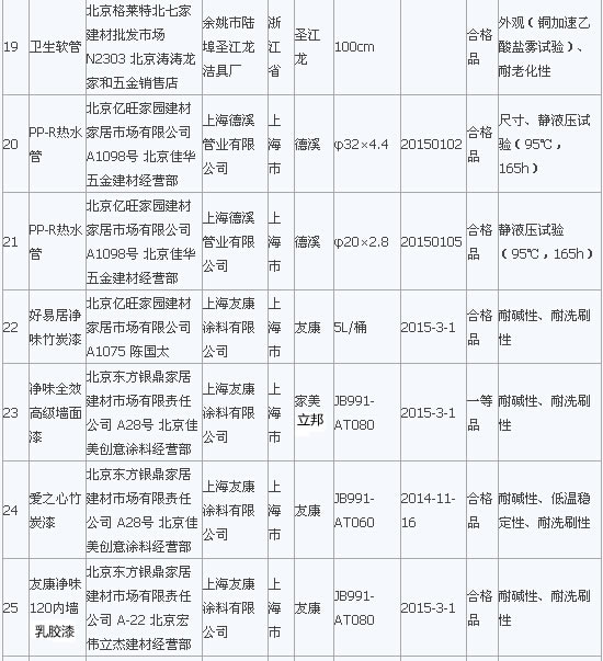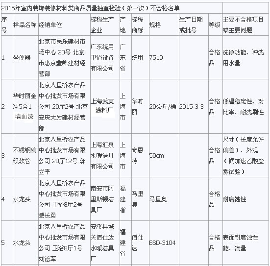 在2015年流通領域商品質量抽檢工作中,北京市工商局對北京市市場上銷售的室內裝飾裝修材料類商品進行了抽檢。抽檢結果顯示膠粘劑全部合格,發(fā)現水龍頭、軟管、PP-R管、墻漆涂料等類別中標稱“統(tǒng)用”、“華時麗”、“馬里奧”等品牌29種室內裝飾裝修材料存在問題,主要問題為衛(wèi)生潔具的洗凈功能、水封深度、沖洗用水量、水封回復功能項目,水龍頭的表面耐腐蝕性能、流量、管螺紋精度項目,墻漆涂料耐堿性、低溫穩(wěn)定性、對比率、耐洗刷等項目不符合相關標準要求。