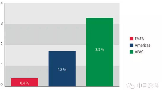 盡管2014-2015年全球涂料產量預計增長2.1%,但各地區市場增長情況明顯不同。預計EMEA(0.4%)和美洲地區(1.8%)的增速會低于全球平均水平,亞太地區(3.3%)的增速則高于全球平均水平。