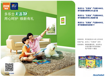 為了能讓更多的家庭享受和體驗多樂士環(huán)保無添加產(chǎn)品的優(yōu)異環(huán)保品質(zhì),從即日起到2014年12月28日多樂士聯(lián)合百安居,在廣州、深圳百安居指定門店舉行“多樂士無添加,用心呵護,煥新有禮”的大型團購活動。以豐厚的回饋感謝廣大消費者對多樂士無添加的喜愛和關(guān)注。