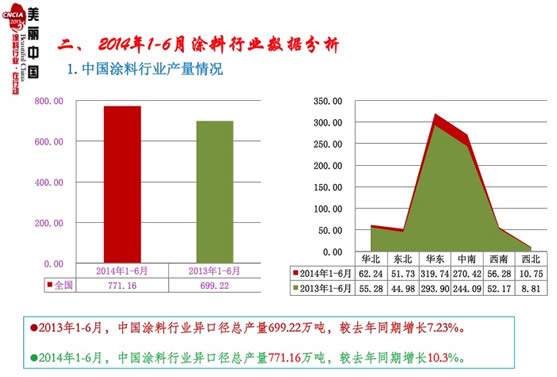 2014年我國的宏觀政策調整為“穩增長、調結構、不刺激”,宏觀經濟進入新常態階段,在此經濟換檔期,“縱觀整個行業,呈現出涂料產量、產值增速放緩但好于上年同期,企業利潤普遍有所增加,民用涂料經營狀況好于工業涂料,民用涂料的低利潤和工業涂料的較高利潤逐漸趨同,行業自律和市場監測在行業開始興起,VOC越來越受到重視,含鉛涂料限制使用的突出特點。”(引自中國涂料工業協會會長孫蓮英主題報告)