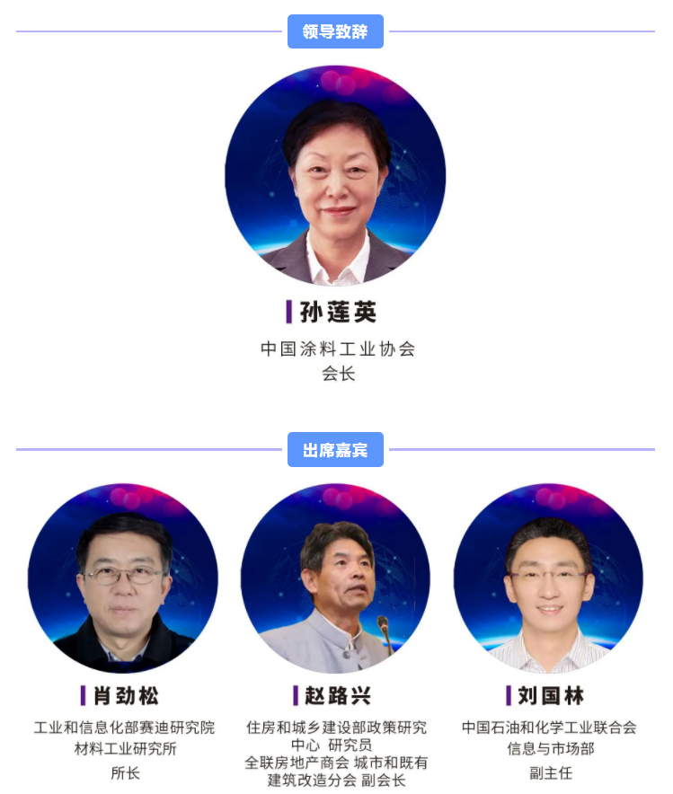 中國涂料工業協會孫蓮英會長、工業和信息化部賽迪研究院材料工業研究所所長肖勁松、住房和城鄉建設部政策研究中心研究院&全聯房地產商會城市和既有建筑改造分會副會長趙興路、中國石油和化學工業聯合會信息與市場部副主任劉國林等嘉賓將出席會議,為會議致辭或發表主題演講。