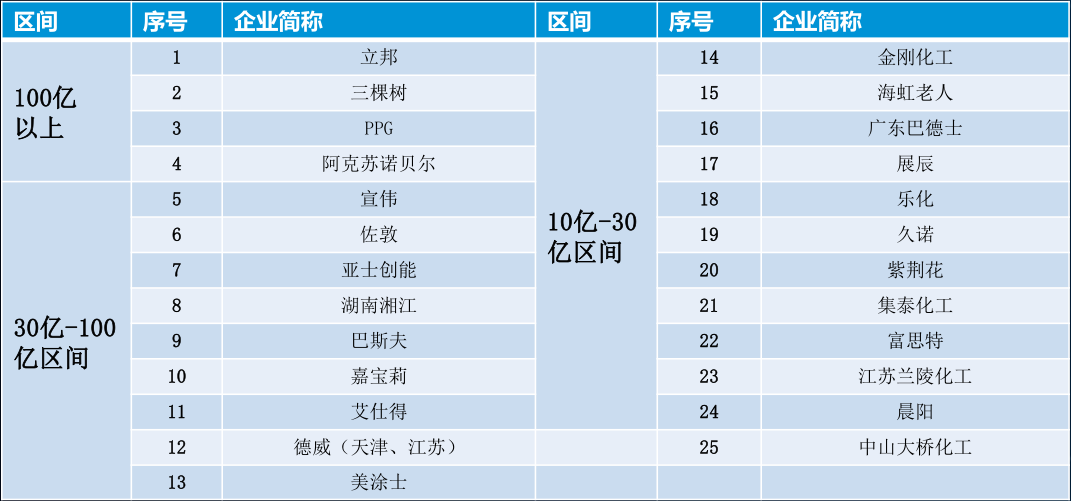 他還對行業“一百指數”企業進行了概括分析。他表示,可喜的是,中國100億元以上的涂料企業已經有四家,30~100億元的企業有9家,10~30億元的企業有12家,種種跡象表明,中國涂料已經在由大而強的路上邁出了可喜的一步。