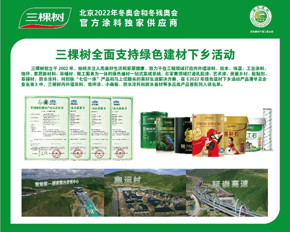 今年兩會期間,全國人大代表、三棵樹涂料股份有限公司董事長洪杰建議,推動綠色建材下鄉,助力美麗鄉村建設,落實國家“雙碳”戰略。這與國家綠色高質量發展的戰略高度契合。在綠色建材下鄉首批公布的《2022年綠色建材下鄉活動產品清單及企業名錄》中,三棵樹內外墻涂料、地坪漆、小森板、防水涂料和防水卷材等多品類產品也首批列入該名單。目前已有三百多個產品獲得綠色建材產品認證,標志著三棵樹綠色產品始終走在行業的前列。
