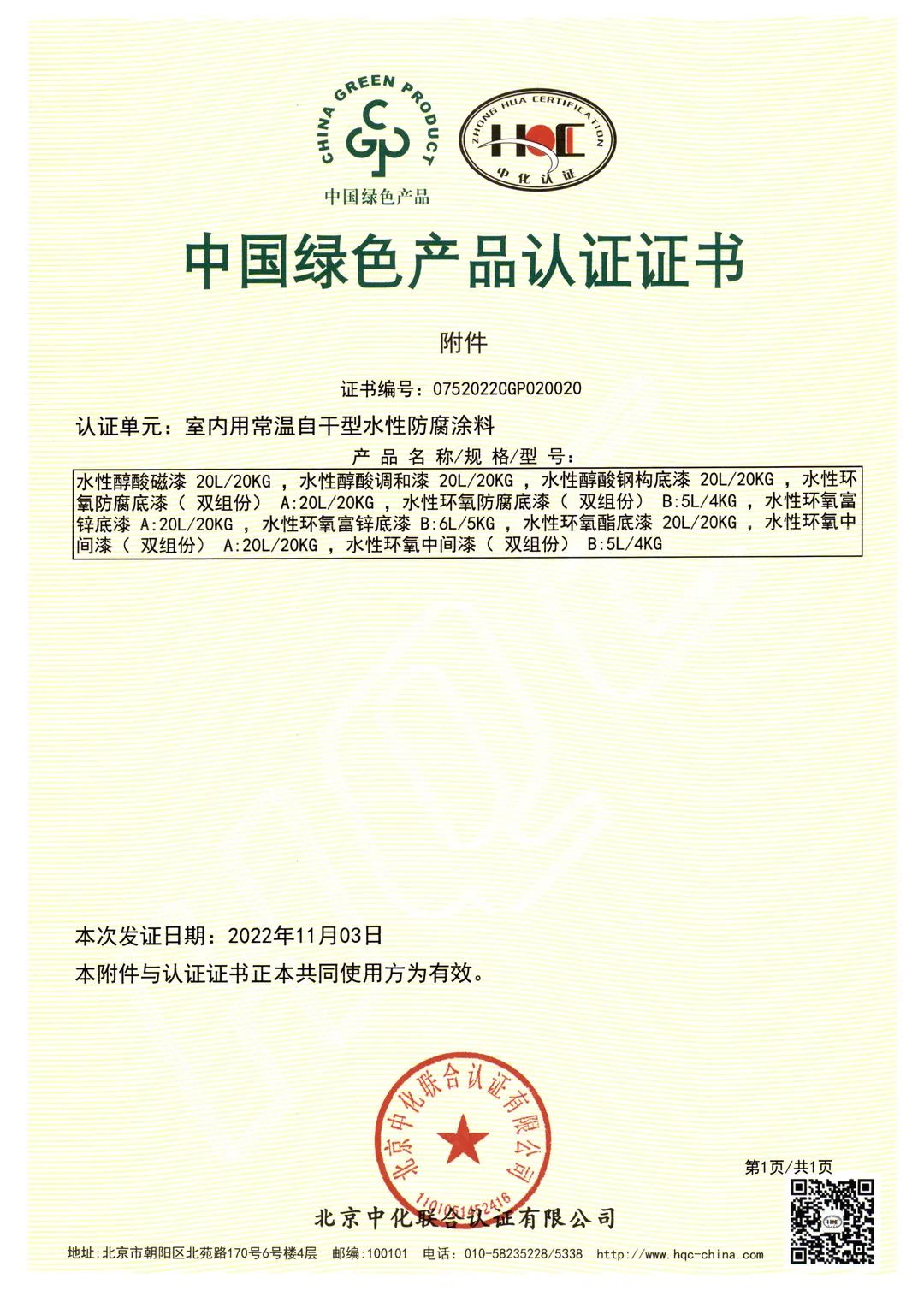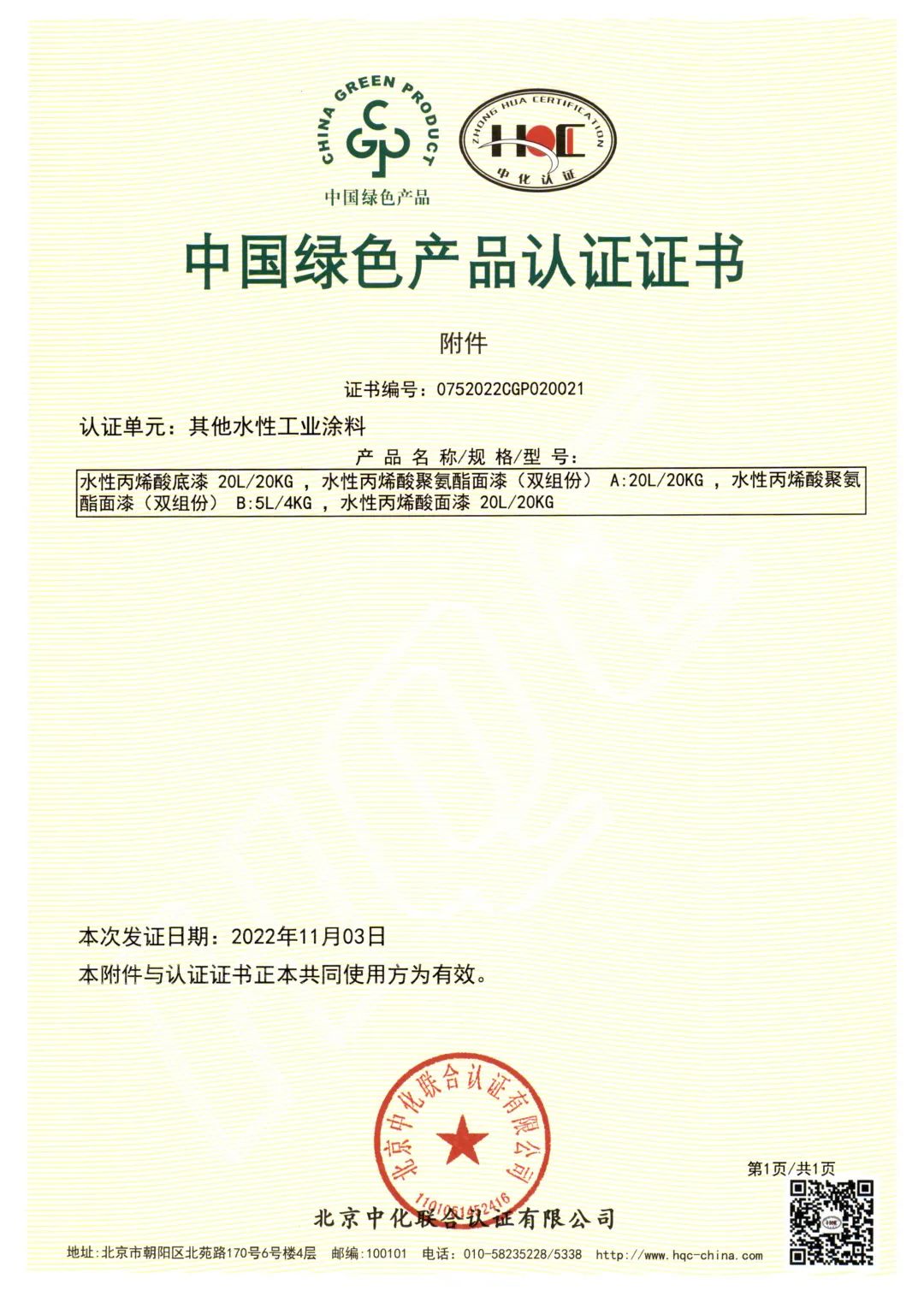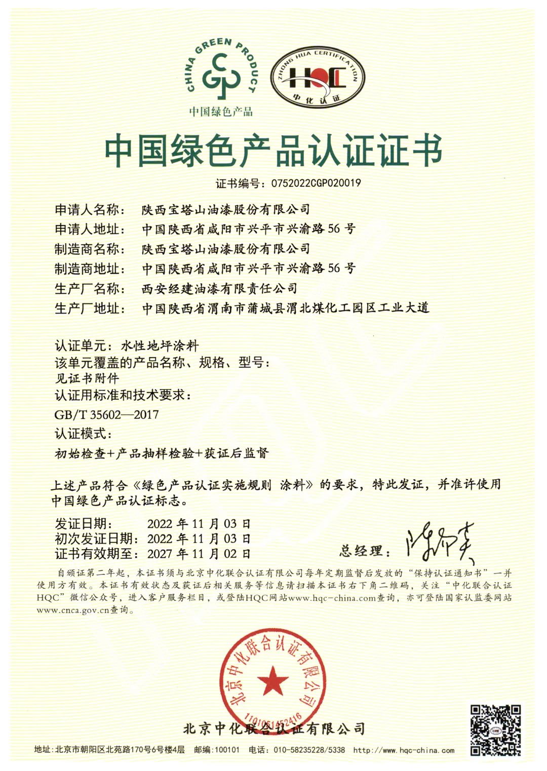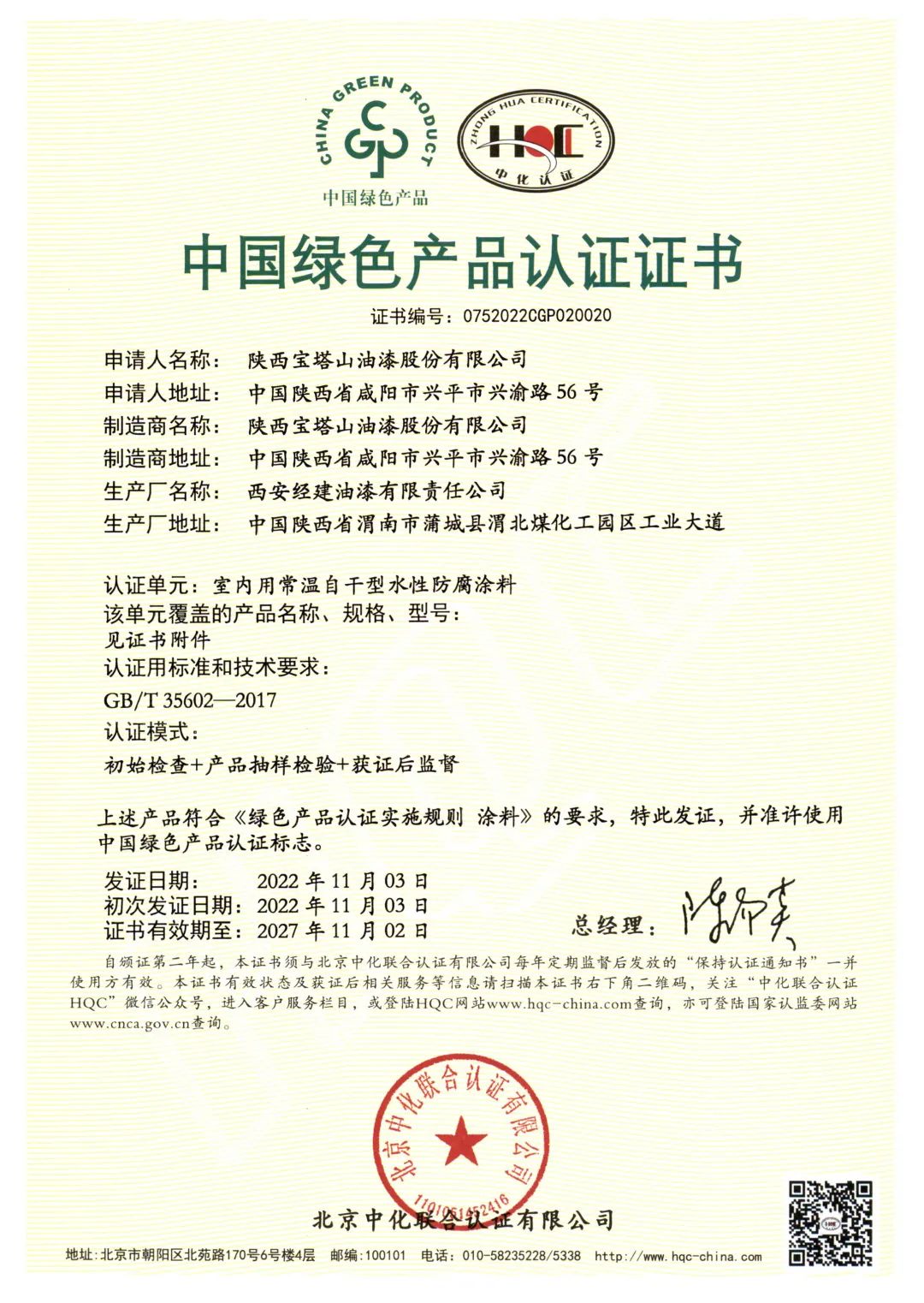 北京中化聯(lián)會認(rèn)證有限公司(HQC)資深專家根據(jù)國家標(biāo)準(zhǔn)GB/T35602-2017《綠色產(chǎn)品評價(jià) 涂料》和CNCA-CGP-02:2021《綠色產(chǎn)品認(rèn)證實(shí)施規(guī)則 涂料》的要求,對寶塔山漆水性地坪涂料、室內(nèi)用常溫自干型水性防腐涂料、其他水性工業(yè)涂料3個(gè)單元11款產(chǎn)品,從資源、能源、環(huán)境、品質(zhì)4大指標(biāo)進(jìn)行評審,并順利通過審核,獲得中國綠色產(chǎn)品認(rèn)證。