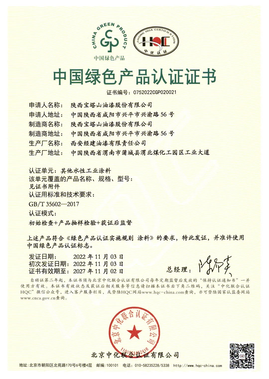 這是寶塔山漆繼去年晉級國家級專精特新小巨人企業(yè)(第一批第一年)以來,榮獲的又一項(xiàng)國家級認(rèn)證,成為國家重點(diǎn)推薦使用的綠色產(chǎn)品。寶塔山漆將不負(fù)榮譽(yù),繼續(xù)踐行“美化環(huán)境 造福社會”的企業(yè)使命,以綠色產(chǎn)品助力國家實(shí)現(xiàn)碳達(dá)峰、碳中和。