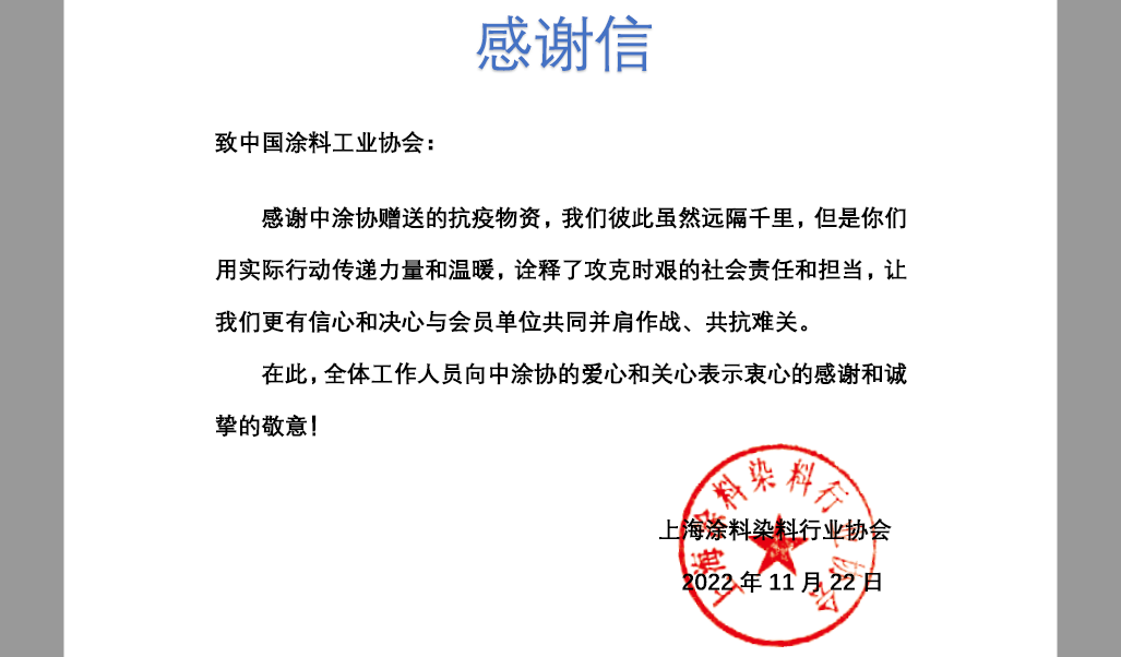 上海涂料染料行業(yè)協(xié)會感謝信
