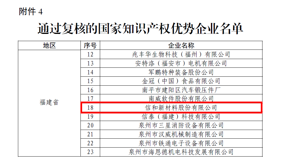 信和于2016年首次通過國家知識產權優勢企業認定,2019年順利通過了一輪復核認定,本次第二輪的復核認定,是政府對信和歷年來在知識產權領域取得成績的肯定,充分體現了信和良好的科技創新能力和突出的綜合競爭優勢,有利于進一步推動公司知識產權的發展和管理、不斷增強公司的核心競爭力。