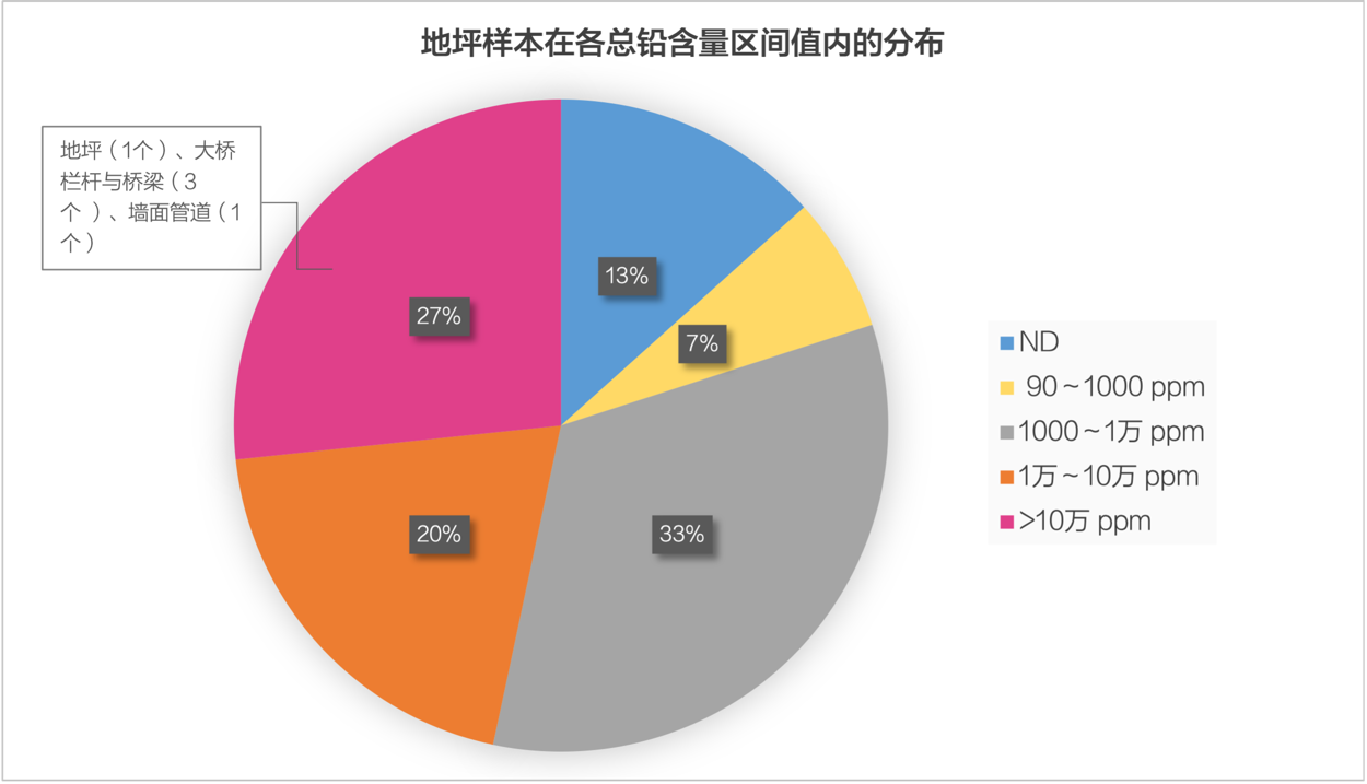 另外,所有4個大橋欄桿及橋梁樣本的總鉛含量均超過1000ppm,其中3個超過10萬ppm。在所有3個墻面樣本中,有1個總鉛含量超過了《GB 18582-2020 建筑用墻面涂料中有害物質限量》中90ppm的限量值,高達1091ppm。