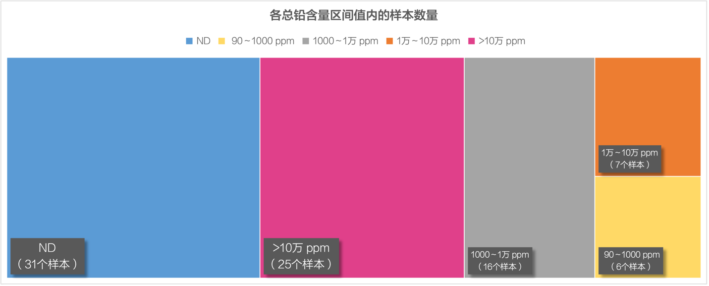 結果顯示,85個樣本中有31個未檢測出鉛成分(以ND表示),約占總樣本的36%,其余樣本的總鉛含量均高于90ppm。如圖1所示,僅6個樣本低于1000ppm(我國目前工業涂料標準中所規定的常用鉛限量值),其中總鉛含量最低的是103ppm。有16個樣本的總鉛含量在1000ppm至10000ppm之內(約占總樣本的19%),7個樣本的總鉛含量在10000ppm至10萬ppm之內(約占總樣本的8%),而多達25個樣本的總鉛含量高于10萬ppm(約占總樣本的29%),其中總鉛含量最高的是作為某兒童游樂設施,其值高達643900ppm。