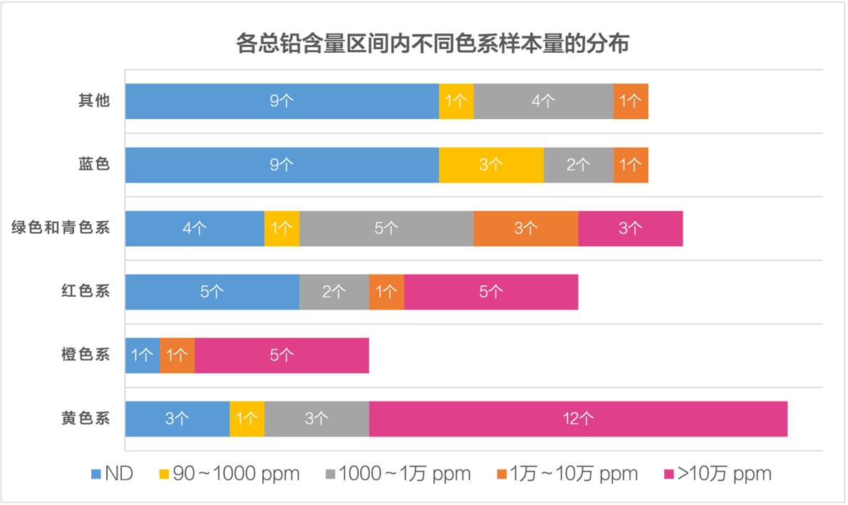 本次調查中的面漆樣本中有70個屬于黃色系(19個)、橙色系(7個)、紅色系(13個)、綠色和青色系(16個)以及藍色系(15個)涂料。本次調查中,檢測出添加有鉛化合物的涂料樣本總量的89%分布于這五個色系中,其中總鉛含量超過10萬ppm的25個樣本均分布于這黃、橙、紅、綠色和青色這四個色系中。如圖7所示,黃、橙和紅色系的涂料總鉛含量超標最為嚴重。19個黃色系樣本中有16個的總鉛含量超過1000ppm(占84%),12個超過10萬ppm(占63%)。7個橙色系樣本中有6個總鉛含量超過1000ppm(占86%),其中5個超過10萬ppm(占71%)。13個紅色系樣本中有8個總鉛量超過1000ppm(占62%),其中5個超過10萬ppm(占38%)。