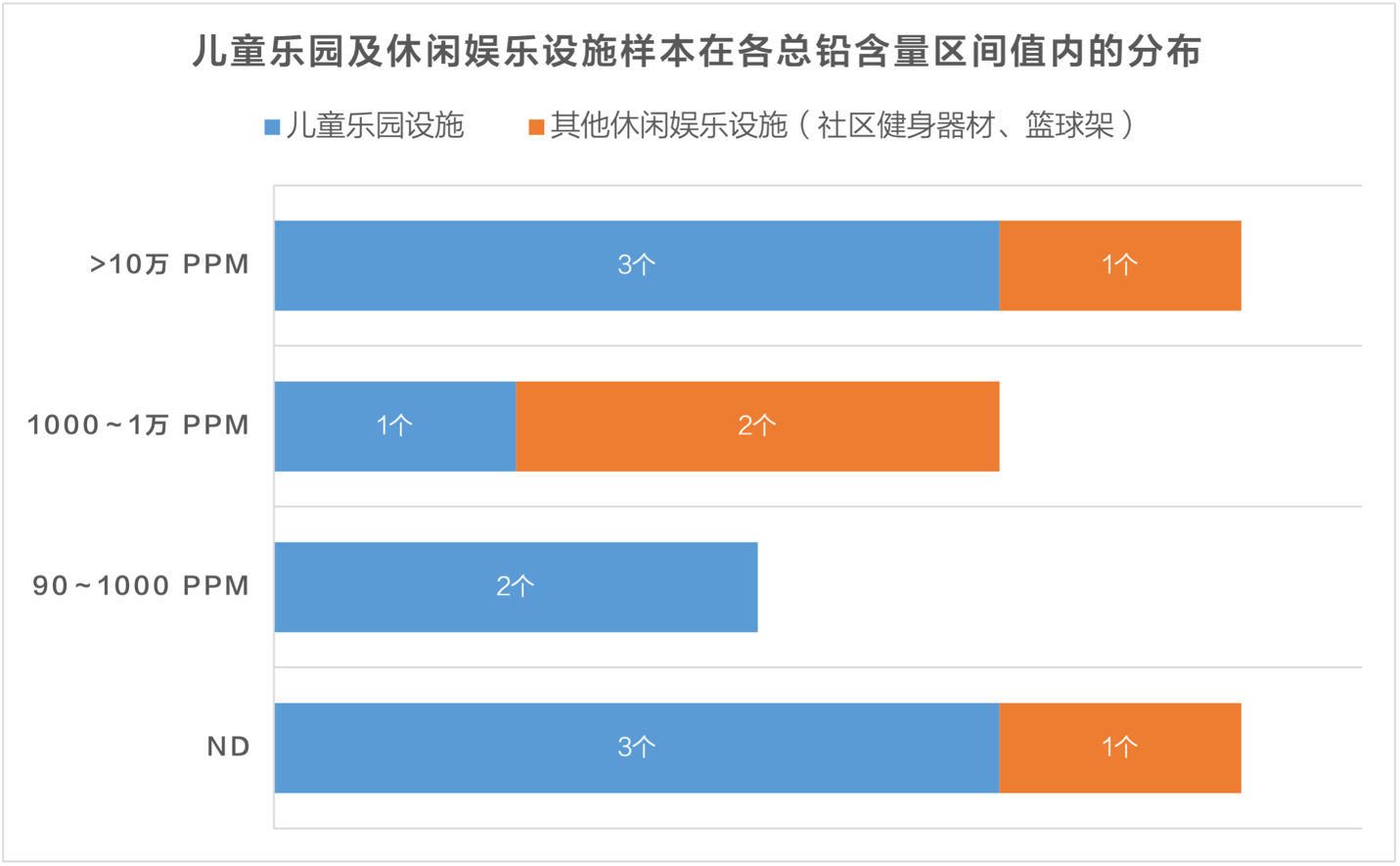 如下圖所示,在13個休閑娛樂場所類場景樣本中,9個是兒童游樂場設施,1個室外籃球架,3個社區健身器材。其中有4個樣本未檢測出重金屬鉛(約占該場景樣本總數的31%),7個樣本的總鉛含量高于1000ppm(約占54%),4個高于10萬ppm(約占31%)。值得注意的是,兒童游樂場設施樣本中有6個總鉛含量超過90ppm ,其中3個超過10萬ppm,分別占兒童娛樂設施樣本總數的67%與33%。其中一個兒童娛樂設施的面漆總鉛含量甚至遠超所有其他場景的樣本,可嚴重危害到兒童的身體健康。