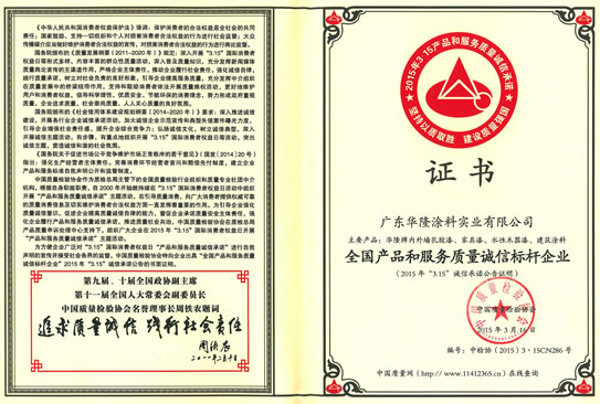 3·15期間,中國質量檢驗協會開展2015年3•15國際消費者權益日“產品和服務質量誠信承諾”主題活動,社會反響熱烈。經國家質檢總局、中國質量檢驗協會的全面鑒定,廣東華隆涂料實業有限公司從上千家企業中脫穎而出,榮獲“全國產品和服務質量誠信標桿企業”!