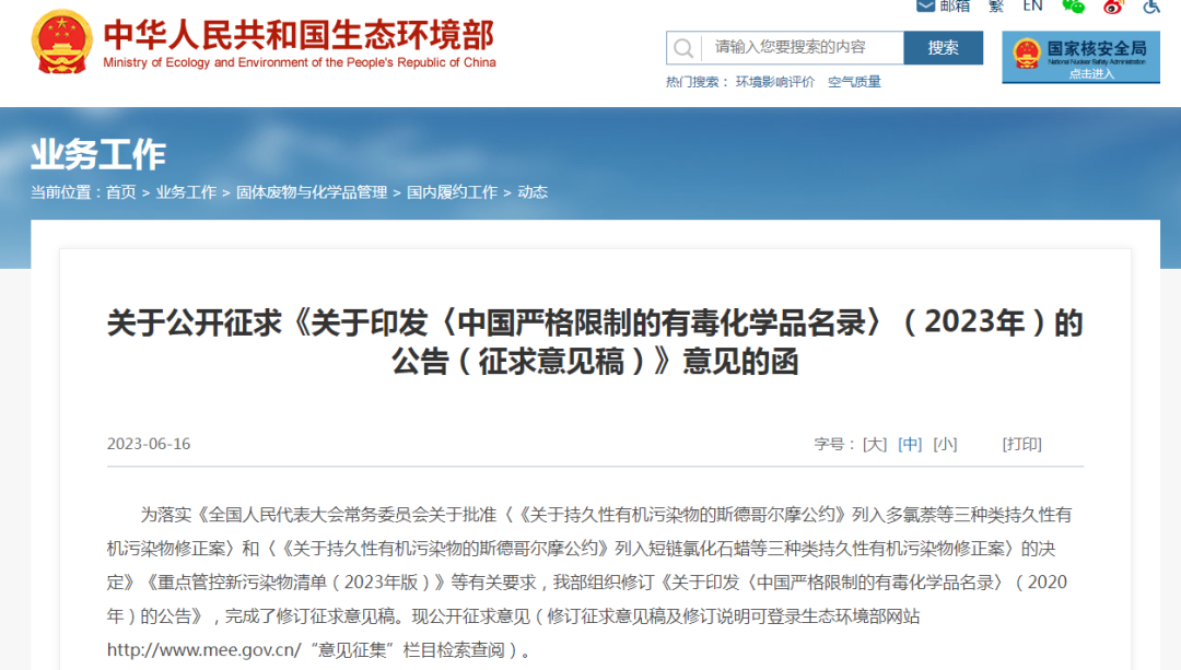 日前,中華人民共和國生態(tài)環(huán)境部發(fā)布公告,公開征求《中國嚴(yán)格限制的有毒化學(xué)品名錄》(2023年)(征求意見稿)。意見指出: