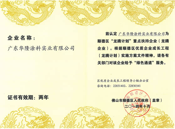 2014年10月,廣東省佛山市順德區(qū)人民政府發(fā)布《關(guān)于新一批龍騰企業(yè)的公示通告》,公布了通過復(fù)評和補(bǔ)增入選“龍騰企業(yè)”共300家企業(yè)名單。廣東華隆涂料實(shí)業(yè)有限公司,連續(xù)三次入選“龍騰企業(yè)”。