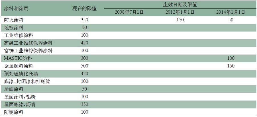 南海岸空氣質(zhì)量管理區(qū)規(guī)定1113是從2003年1月1日起,分5年分階段實(shí)施的,其中一些產(chǎn)品的最后期限是2008年7月1日。{BiMis:page} SCAQMD Rule 1113的最新版本是2011年6月3日的修訂版,接上一版本的2008年7月1日,分2012年1月1日和2014年1月1日兩個(gè)階段。部分涂料和涂層的VOC限值見(jiàn)表3。