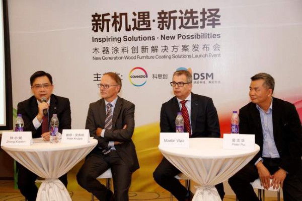 (左起)科思創涂料、粘合劑及特殊化學品業務部亞太區高級副總裁鐘小斌,科思創涂料、粘合劑及特殊化學品業務部應用與技術開發主管彼得·克魯帕,帝斯曼涂料樹脂特種樹脂業務部全球商務總監Martin Vlak,和帝斯曼涂料樹脂亞太區商業總監裴忠華回答媒體提問